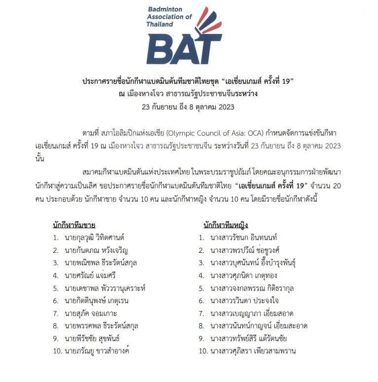สมาคมกีฬาแบดมินตันแห่งประเทศไทย ในพระบรมราชูปถัมภ์ ได้ทำการประกาศรายชื่อนักกีฬา แบดมินตัน ทีมชาติไทย ชุดเตรียมลุยสู้ศึก เอเชียนเกมส์ 2022 ที่หาวโจว สาธารณรัฐประชาชนจีน โดยนักกีฬาชื่อดังของไทยติดทีมชุดนี้อย่างพร้อมเพรียง