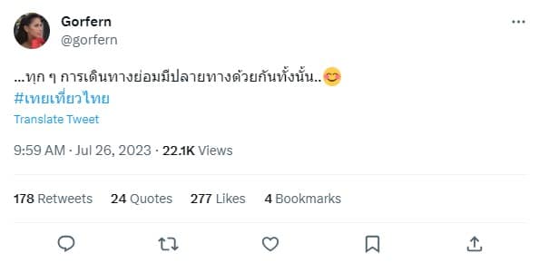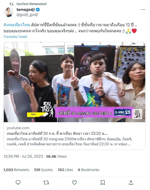“เทยเที่ยวไทย สัปดาห์นี้ปิดซีซั่นแล้วนะคะ 🙂 ซีซั่นที่ยาวนานมาถึงเกือบ 12 ปี ขอบคุณทุกคนจากใจจริง ขอบคุณจริง ๆ ค่ะ จนกว่าจะพบกันใหม่นะคะ :)”