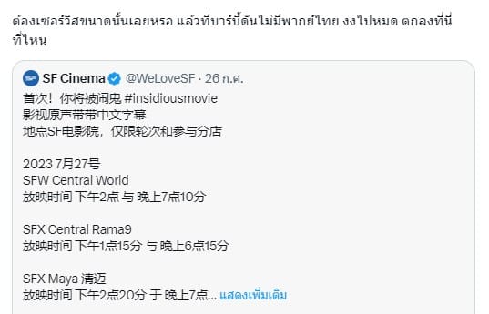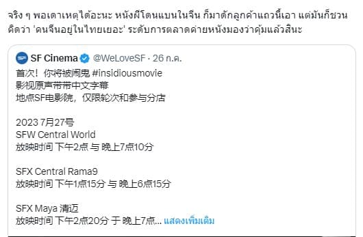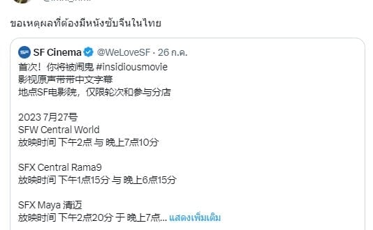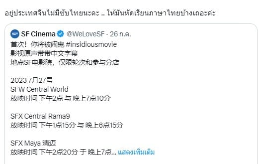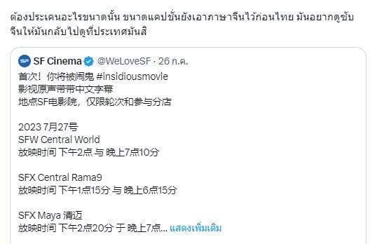 เมื่อวานนี้ 26 กรกฎาคม 2566 โรงภาพยนตร์ SF Cinema ได้ออกมาโพสต์โปรโมทเป็นข้อความภาษาจีนและภาษาไทยว่า
