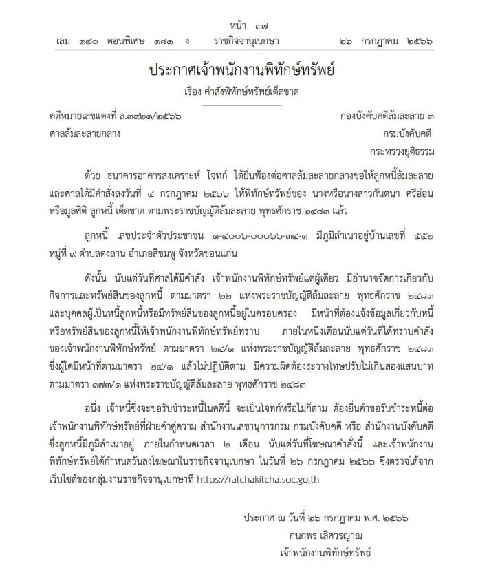 ประกาศด่วน! ราชกิจจานุเบกษา เผย ศาลสั่งพิทักษ์ทรัพย์เด็ดขาด บุคคลนามสกุลดัง ถูกธนาคาร ยื่นฟ้องล้มละลาย มีผลตั้งแต่วันนี้เป็นต้นไป