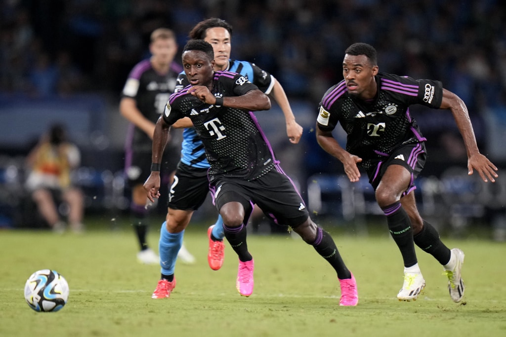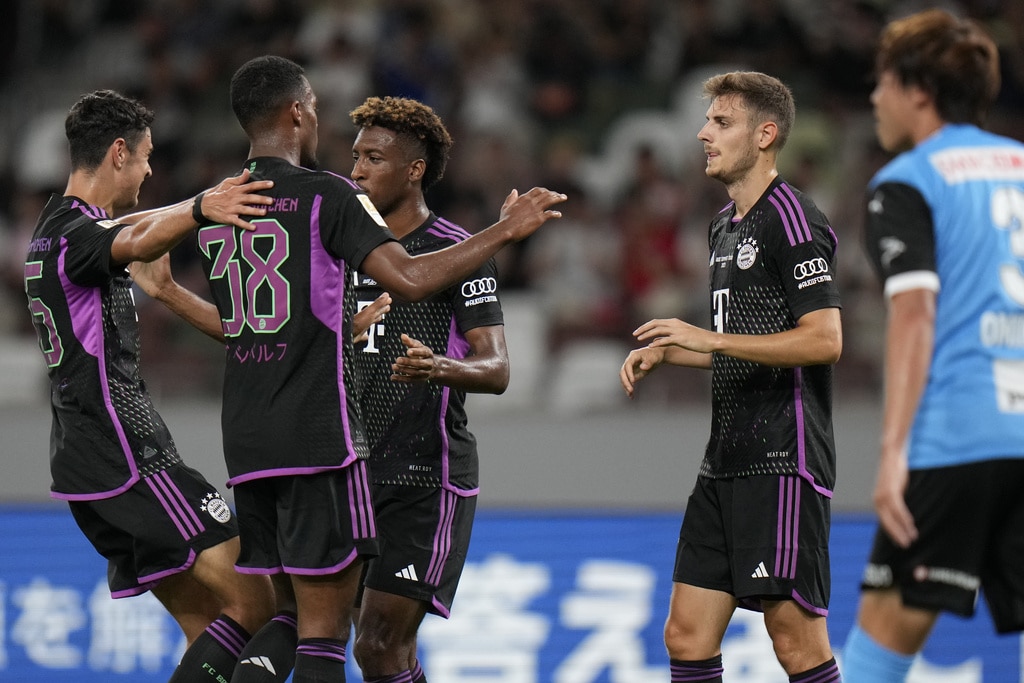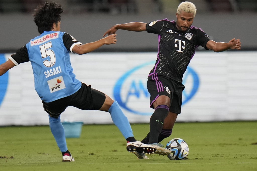 Bayern Munich’s Josip Stanisic, second right, celebrates with teammates after scoring a goal during a friendly soccer match against Kawasaki Frontale at the National Stadium in Tokyo, Japan, Saturday, July 29, 2023.(AP Photo/Shuji Kajiyama)Bayern Munich’s Bouna Sarr, left, and Bayern Munich’s Ryan Gravenberch play during a friendly soccer match against Kawasaki Frontale at the National Stadium in Tokyo, Japan, Saturday, July 29, 2023.(AP Photo/Shuji Kajiyama)Bayern Munich’s Bouna Sarr, right, and Kawasaki Frontale’s Asahi Sasaki, left, vie for the ball during a friendly soccer match at the National Stadium in Tokyo, Japan, Saturday, July 29, 2023.(AP Photo/Shuji Kajiyama)Bayern Munich’s Serge Gnabry, right, dribbles past Kawasaki Frontale’s Asahi Sasaki during a friendly soccer match at the National Stadium in Tokyo, Japan, Saturday, July 29, 2023.(AP Photo/Shuji Kajiyama)