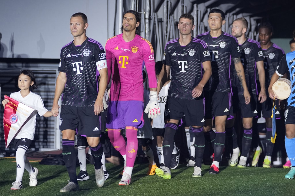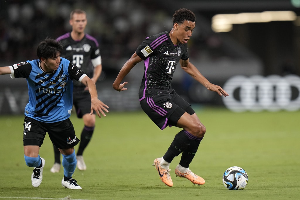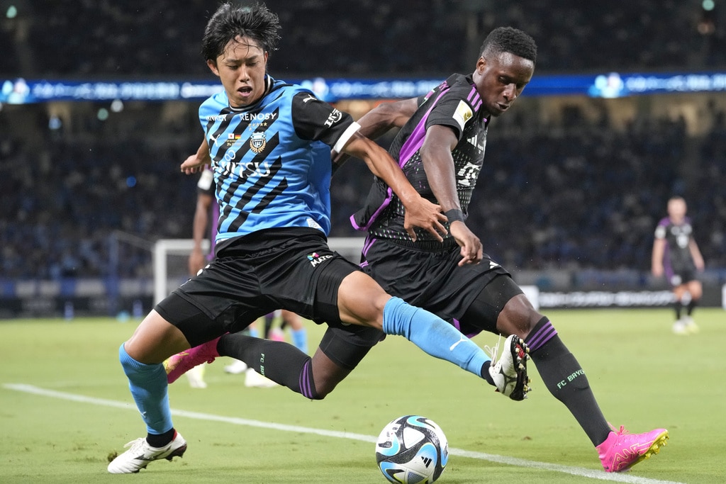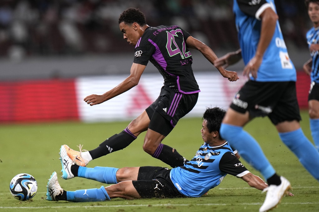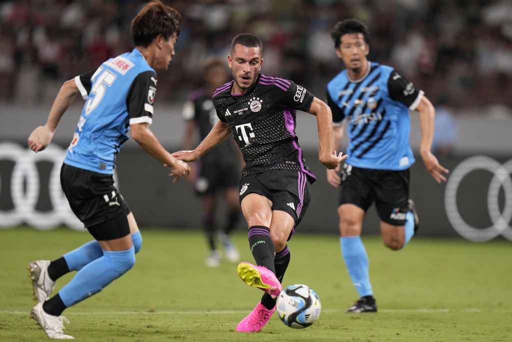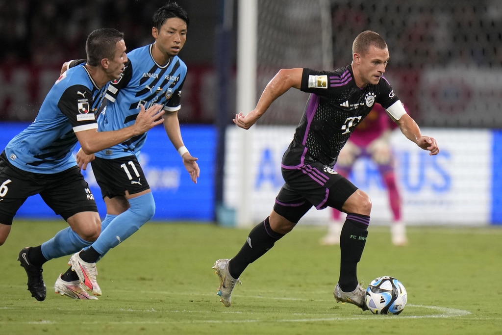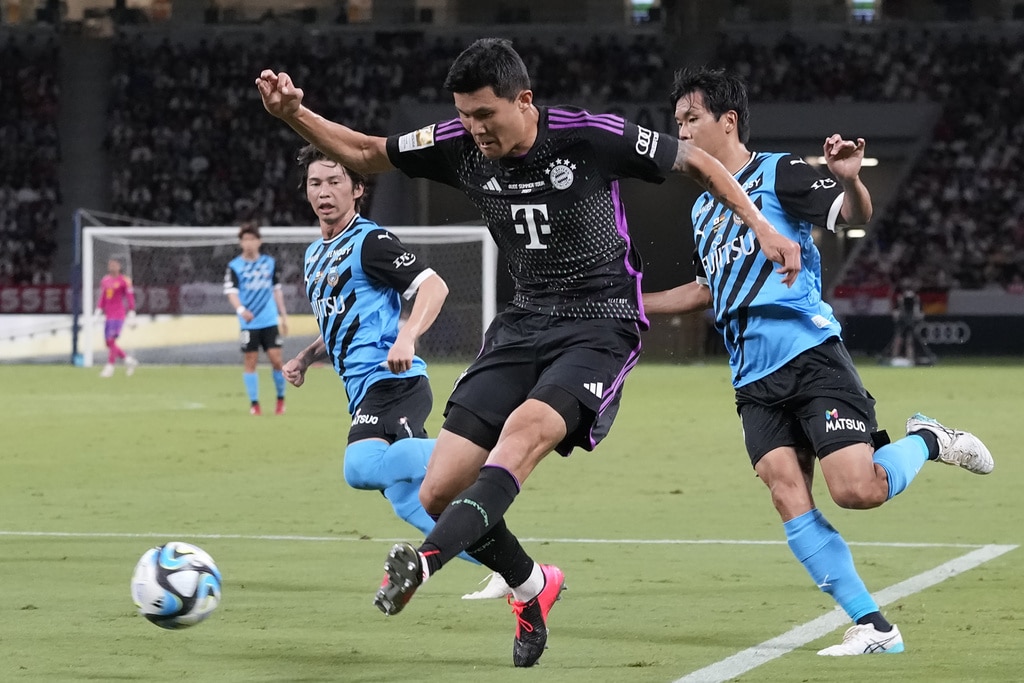 Bayern Munich’s Joshua Kimmich dribbles past Kawasaki Frontale’s Joao Schmidt, left, and Yu Kobayashi, during a friendly soccer match at the National Stadium in Tokyo, Japan, Saturday, July 29, 2023.(AP Photo/Shuji Kajiyama)Bayern Munich’s Jamal Musiala, top, kicks the ball past Kawasaki Frontale’s defense during a friendly soccer match at the National Stadium in Tokyo, Japan, Saturday, July 29, 2023.(AP Photo/Shuji Kajiyama)Bayern Munich’s Jamal Musiala, right, dribbles past Kawasaki Frontale’s Yasuto Wakizaka during a friendly soccer match at the National Stadium in Tokyo, Japan, Saturday, July 29, 2023.(AP Photo/Shuji Kajiyama)Bayern Munich’s Kim Minjae, center, controls the ball during a friendly soccer match against Kawasaki Frontale at the National Stadium in Tokyo, Japan, Saturday, July 29, 2023.(AP Photo/Shuji Kajiyama)