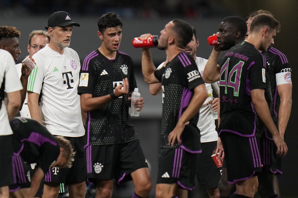 Bayern Munich’s Arijon Ibrahimovic, center, tries to score Kawasaki Frontale defense during a friendly soccer match at the National Stadium in Tokyo, Japan, Saturday, July 29, 2023.(AP Photo/Shuji Kajiyama)Bayern Munich’s manager Thomas Tuchel, left, looks on his players during a friendly soccer match against Kawasaki Frontale at the National Stadium in Tokyo, Japan, Saturday, July 29, 2023.(AP Photo/Shuji Kajiyama)