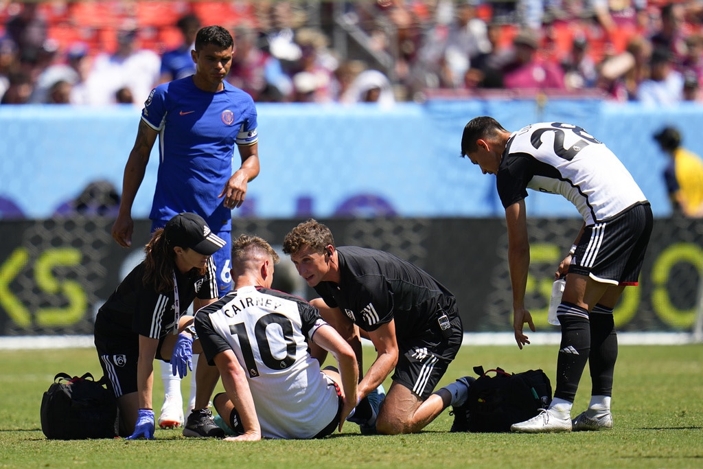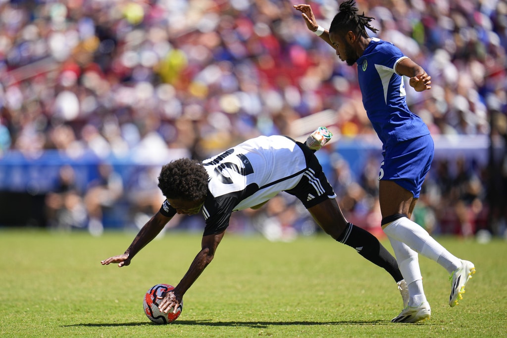 Chelsea’s Ben Chilwell, top, takes a shot against Fulham’s Kenny Tete during a Premier League Summer Series soccer match, Sunday, July 30, 2023, in Landover, Md. (AP Photo/Julio Cortez)Fulham goalkeeper Bern Leno, right, looks on as Chelsea’s Enzo Fernandez (5) and Carney Chukwuemeka (30) celebrate a goal by Christopher Nkunku during a Premier League Summer Series soccer match, Sunday, July 30, 2023, in Landover, Md. (AP Photo/Julio Cortez)Fulham’s William, left, is fouled by Chelsea’s Christopher Nkunku during a Premier League Summer Series soccer match, Sunday, July 30, 2023, in Landover, Md. (AP Photo/Julio Cortez)Chelsea’s Raheem Sterling shoots against Fulham during a Premier League Summer Series soccer match, Sunday, July 30, 2023, in Landover, Md. (AP Photo/Julio Cortez)Chelsea’s Thiago Silva reacts after scoring a goal on Fulham during a Premier League Summer Series soccer match, Sunday, July 30, 2023, in Landover, Md. (AP Photo/Julio Cortez)Trainers take a look at Fulham’s Tom Cairney during a Premier League Summer Series soccer match against Chelsea, Sunday, July 30, 2023, in Landover, Md. (AP Photo/Julio Cortez)