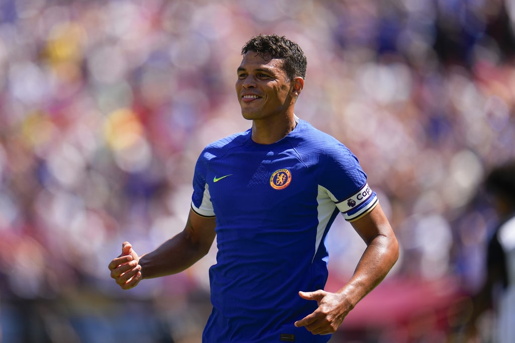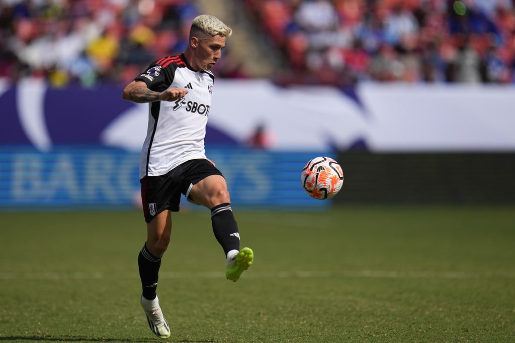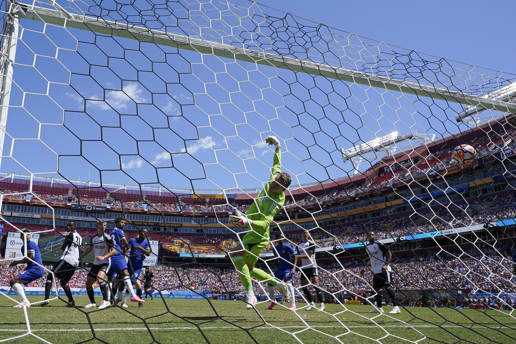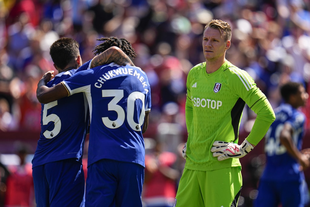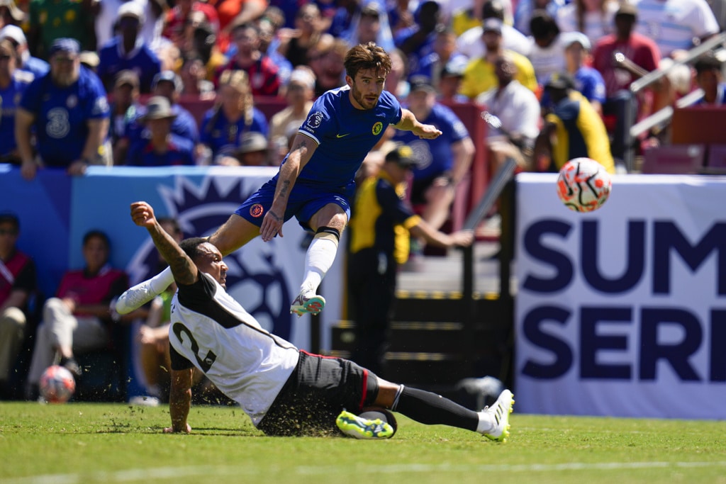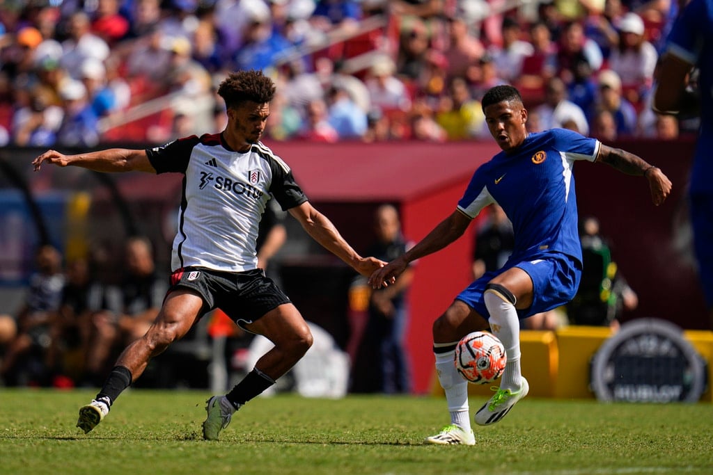Chelsea’s Angelo, right, attacks against Fulham’s Antonee Robinson during a Premier League Summer Series soccer match, Sunday, July 30, 2023, in Landover, Md. Chelsea won 2-0. (AP Photo/Julio Cortez)Fulham’s Raul, left, goes up for the ball against Chelsea goalkeeper Gabriel Slonina during a Premier League Summer Series soccer match, Sunday, July 30, 2023, in Landover, Md. Chelsea won 2-0. (AP Photo/Julio Cortez)Fulham’s Harry Wilson controls the ball against Chelsea during a Premier League Summer Series soccer match, Sunday, July 30, 2023, in Landover, Md. Chelsea won 2-0. (AP Photo/Julio Cortez)A header by Chelsea’s Thiago Silva, far left, gets by Fulham goalkeeper Bern Leno, center, for a goal during a Premier League Summer Series soccer match, Sunday, July 30, 2023, in Landover, Md. (AP Photo/Julio Cortez)