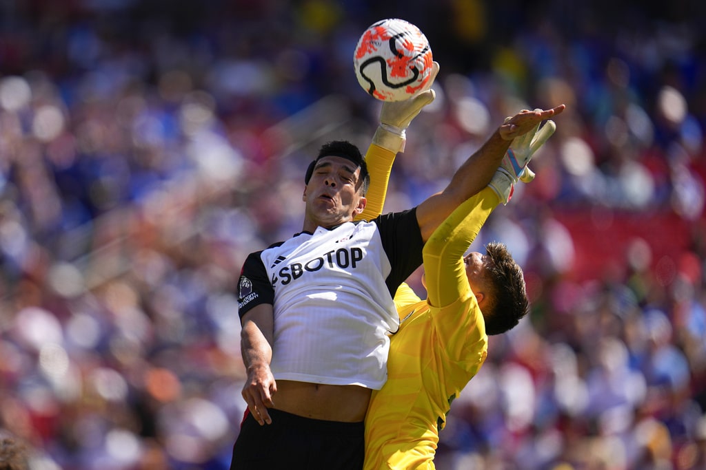 Fulham’s Raul, left, goes up for the ball against Chelsea goalkeeper Gabriel Slonina during a Premier League Summer Series soccer match, Sunday, July 30, 2023, in Landover, Md. Chelsea won 2-0. (AP Photo/Julio Cortez)