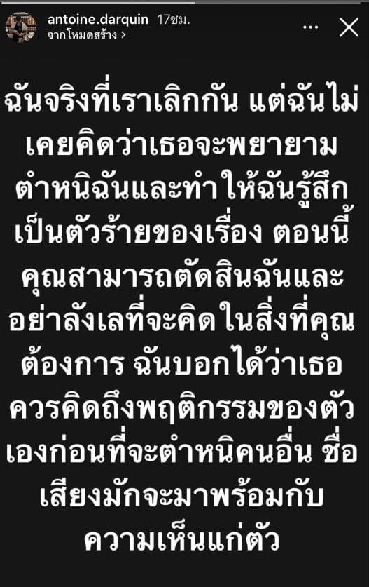 “ฉันจริงที่เราเลิกกัน แต่ฉันไม่เคยคิดว่าเธอจะพยายามตำหนิฉันและทำให้ฉันรู้สึกเหมือนตัวร้ายของเรื่องนี้ ตอนนี้คุณสามารถตัดสินฉันและอย่าลังเลที่จะคิดในสิ่งที่คุณต้องการ ฉันบอกได้ว่าทุกคนคิดถึงพฤติกรรมของตัวเองก่อนที่จะตำหนิคนอื่น ชื่อเสียงมักจะมาพร้อมกับความเห็นแก่ตัว”