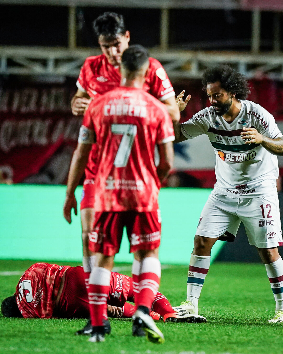 🚨AGORA: Jogador do Argentinos Jrs quebrou a perna em pisão, sem querer, do Marcelo. Expulso, o jogador do Fluminense saiu chorando de campo.