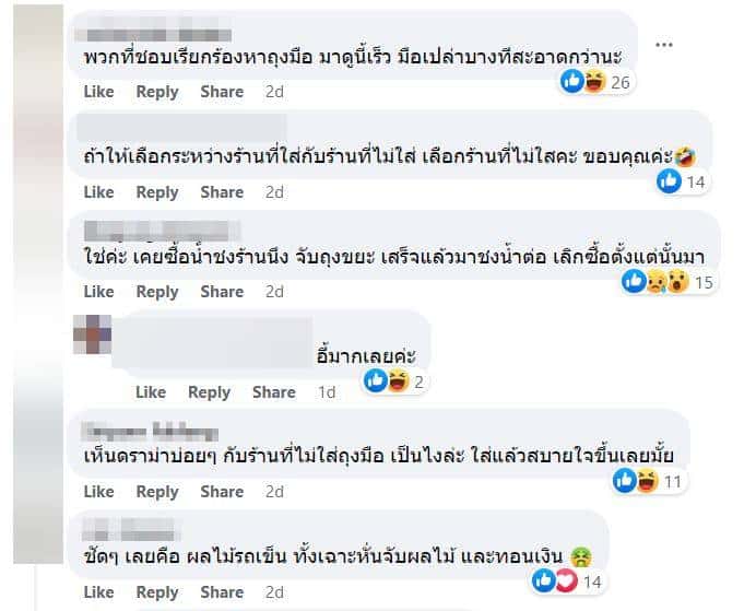 “เข้าใจนะ ว่าหลาย ๆ ร้าน ก็ทำแบบนี้ และน่าจะเป็นเรื่องปกติ เลยอยากรู้ว่า เราไม่ต้องคิดมากใช่ไหม หรือคนหลังร้านก็ใส่ถุงมือแล้วจับทุกอย่างเหมือนกัน สบายใจได้ มุแง้”