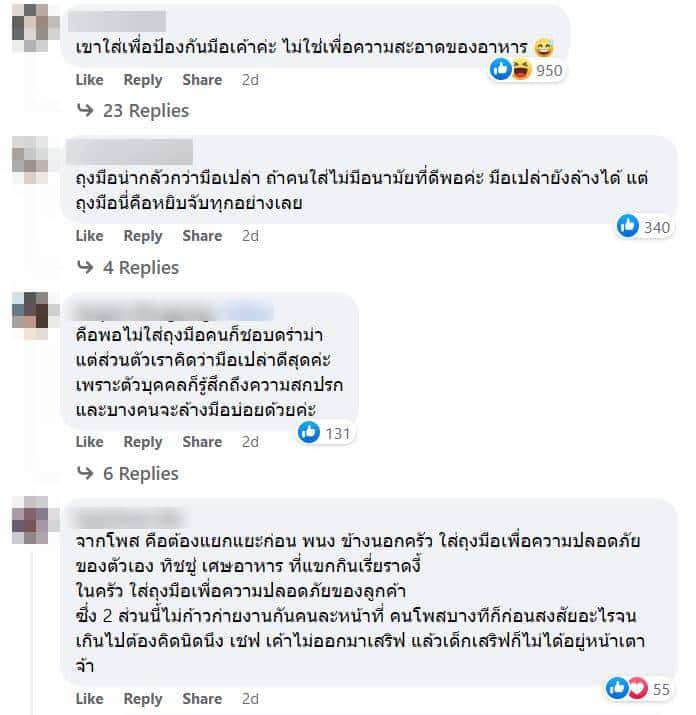 ไล่ตั้งแต่ “เขาใส่เพื่อป้องกันมือเค้าค่ะ ไม่ใช่เพื่อความสะอาดของอาหาร ” ซึ่งข้อความนี้ก็ดูจะมีการจิกกัดเบา ๆ ไปยังตัวของฝั่งร้านอาหารและผู้ประกอบการ