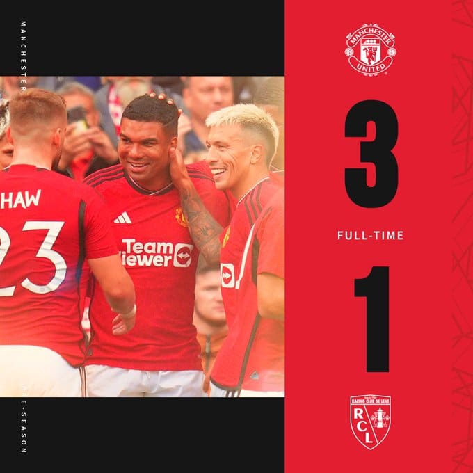 ผลการแข่งขันปรากฏว่า ปีศาจแดงได้เฮแล้ว หลังผลงานอุ่นเครื่องพ่ายมา 3 นัดติด เกมนี้เปิดตัวกองหน้าใหม่ ราสมุส ฮอยลุนด์ ก่อนที่ แมนฯ ยูไนเต็ด จะพลิกสถานการณ์หลังโดนยิงไปก่อนจากเกมรับที่จ่ายบอลผิดพลาด แต่กลับมาเอาชนะ ล็องส์ ไปแบบสนุก โดยได้ มาร์คัส แรชฟอร์ด ทั้งยิงทั้งจ่าย บวกกับ อันโตนี่ และ กาเซมีโร่ จัดอีกคนละเม็ดคว้าชัยต่อหน้าแฟนบอลในโอลด์ แทร็ฟฟอร์ด