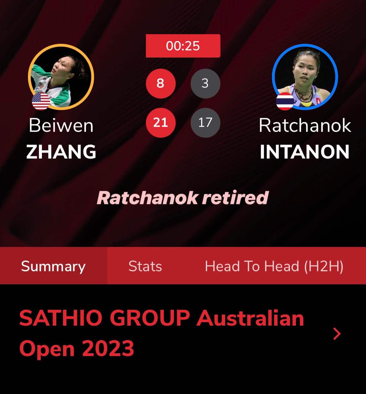 “เมย์” รัชนก อินทนนท์ นักแบดมินตันสาวไทยมืออันดับ 7 ของโลก แพ้รีไทร์จากการแข่งขันในรอบรองชนะเลิศ แบดมินตัน ออสเตรเลียน โอเพ่น 2023 หลังมีอาการบาดเจ็บในเกมที่ 2 ตกรอบไปอย่างน่าเสียดาย