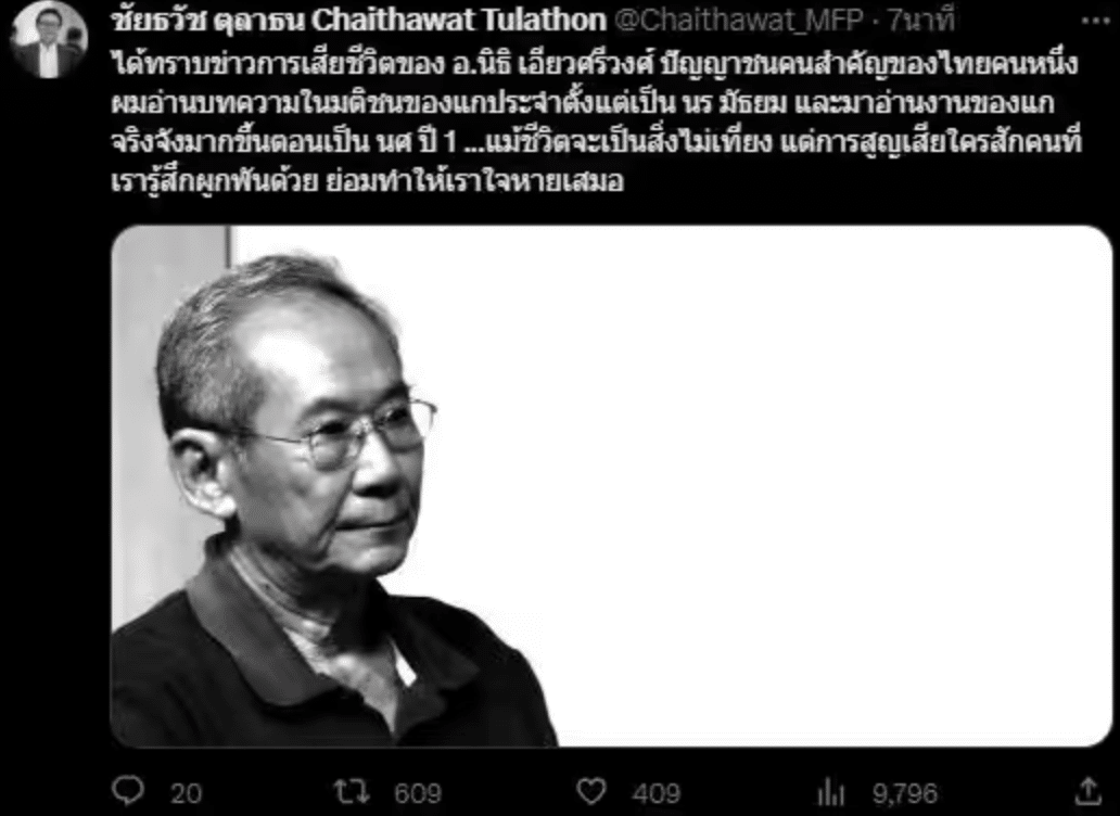 นายชัยธวัช ตุลาธน เลขาธิการพรรคก้าวไกล ได้เขียนข้อความอาลัยต่อการเสียชีวิตของ อ.นิธิ ระบุว่า “ได้ทราบข่าวการเสียชีวิตของ อ.นิธิ เอียวศรีวงศ์ ปัญญาชนคนสำคัญของไทยคนหนึ่ง ผมอ่านบทความในมติชนของแกประจำตั้งแต่เป็น น.ร. มัธยม และมาอ่านงานของแกจริงจังมากขึ้นตอนเป็น น.ศ. ปี 1 …แม้ชีวิตจะเป็นสิ่งไม่เที่ยง แต่การสูญเสียใครสักคนที่เรารู้สึกผูกพันด้วย ย่อมทำให้เราใจหายเสมอ”