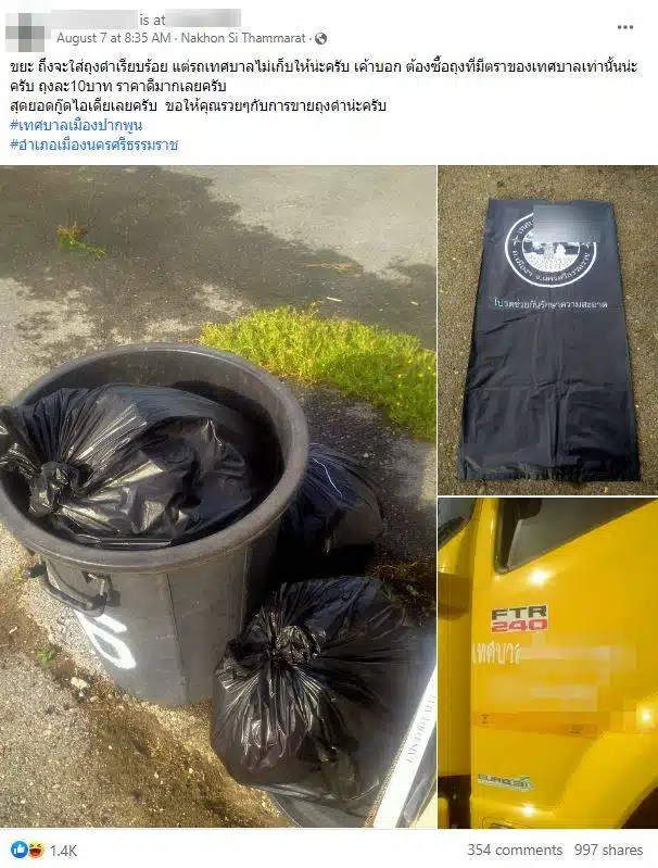 วันที่ 9 สิงหาคม 2566 ผู้ใช้เฟซบุ๊กรายหนึ่งได้โพสต์รูปภาพถังขยะตั้งอยู่ ณ ที่แห่งหนึ่งซึ่งไม่ได้มีการระบุพิกัดชี้ชัด โดยมีเพียงข้อความที่เขียนบรรยายเพิ่มเติมว่า “ขยะ ถึงจะใส่ถุงดำเรียบร้อย แต่รถเทศบาลไม่เก็บให้นะครับ เค้าบอกต้องซื้อถุงที่มีตราของเทศบาลเท่านั้นนะครับ ถุงละ 10 บาท ราคาดีมากเลยครับ สุดยอดกู๊ดไอเดียเลยครับ ขอให้คุณรวยๆ กับการขายถุงดำนะครับ”