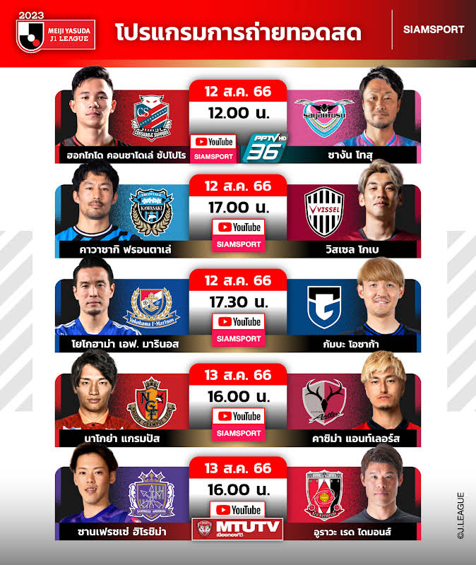 - 17:30 โยโกฮาม่า มารินอส พบ กัมบะ โอซาก้า *ถ่ายทอดสดทาง Siamsport*
