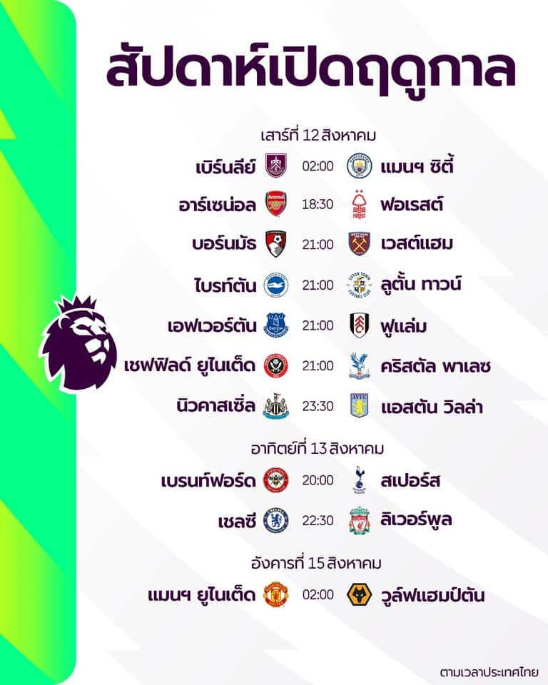 โปรแกรมพรีเมียร์ลีก 2023/24 สัปดาห์ที่ 1 แข่งวันที่ 11-14 ส.ค นี้ เช็คตารางแข่งพร้อมช่องดูบอลสด