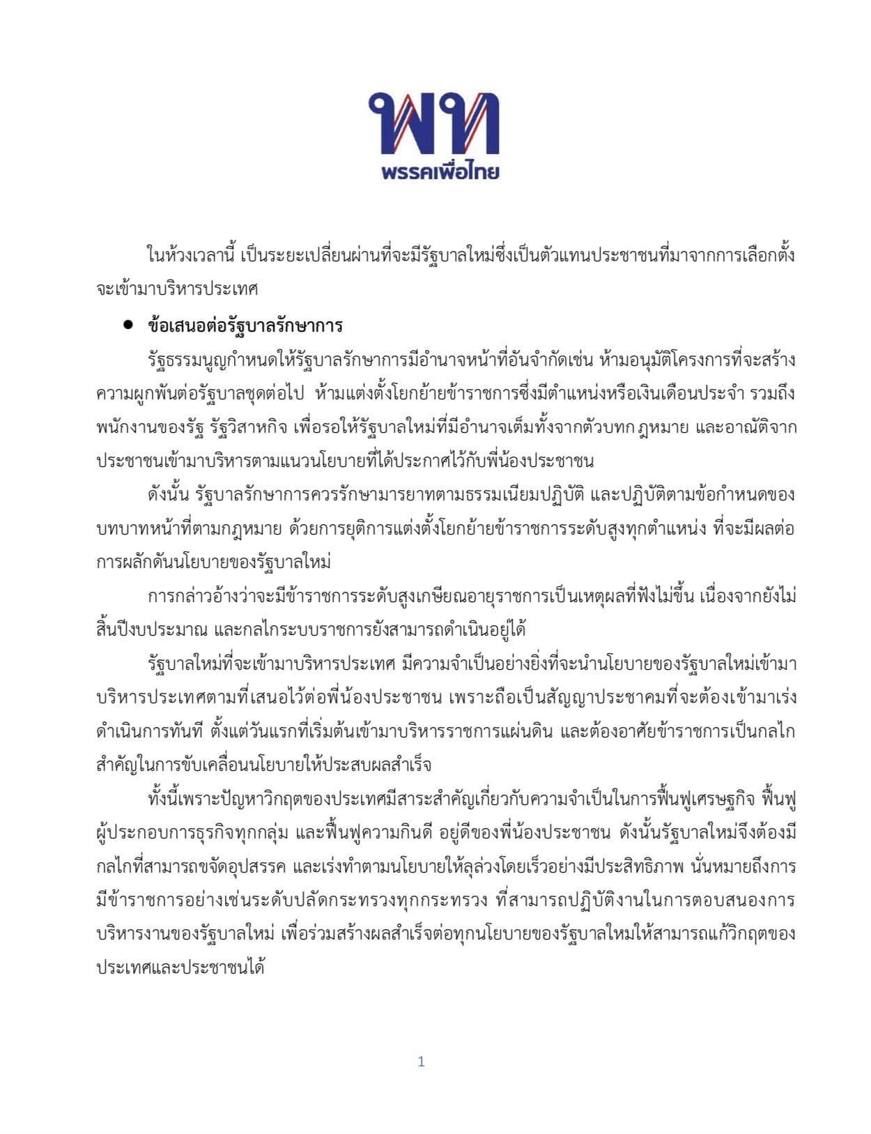 เพื่อไทย ออกเอกสารติงรัฐบาลรักษาการ หยุดแต่งตั้งโยกย้ายรัฐบาลระดับสูง รอรัฐบาลใหม่เข้ามา เพราะจะมีผลต่อการผลักดันนโยบาย