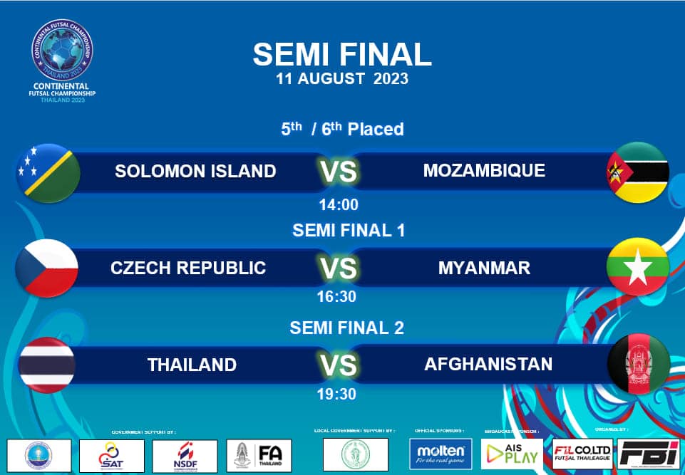 ทีมชาติไทย เตรียมลุยศึก Continental Futsal Championship Thailand 2023 ณ สนามบางกอก อารีน่า โดยฟุตซอลไทยทำผลงานในรอบแบ่งกลุ่มได้อย่างยอดเยี่ยมเก็บชัยสองนัดรวด ผ่านเข้ารอบรองชนะเลิศในฐานะแชมป์กลุ่มเอ ไปพบกับ ทีมชาติอัฟกานิสถาน รองแชมป์กลุ่มบี ในเย็นวันที่ 11 ส.ค 2566 นี้