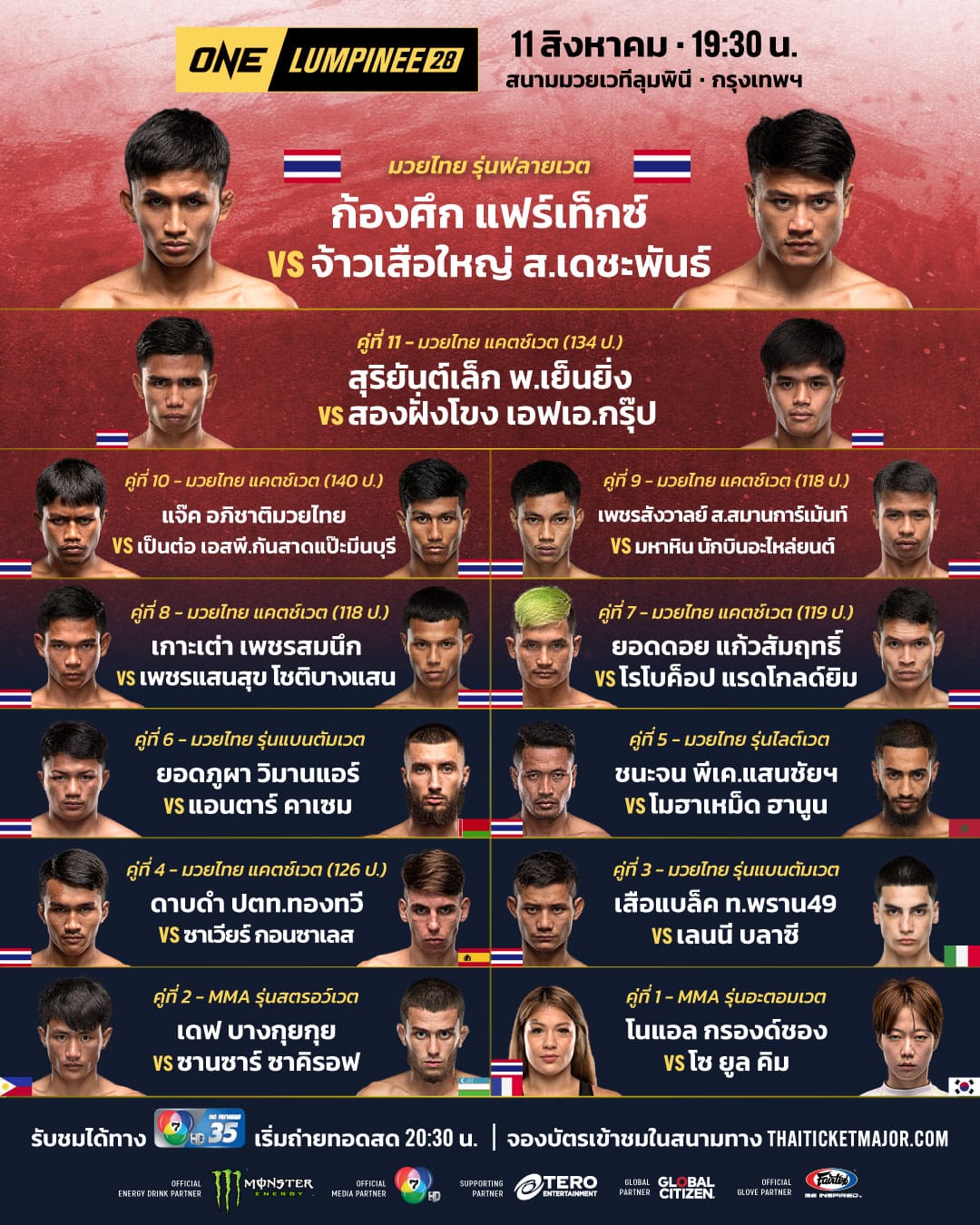 โปรแกรมมวย ONE ลุมพินี 28 สัปดาห์นี้ คู่เอก “ก้องศึก แฟร์เท็กซ์” มวยซ้ายบู๊ดุดัน วัย 23 ปี จากเมืองย่าโมโคราช ขอวัดความแรง “จ้าวเสือใหญ่ ส.เดชะพันธ์” มวยจอมเข่าลอย วัย 21 ปี จากเมืองหลวง ที่ไฟต์แรกต่างเปิดตัวแจ่มเก็บชัยเหนือคู่ชกได้แบบน่าประทับใจ โดยจะเจอกันในกติกามวยไทย รุ่นฟลายเวต (125 – 135 ป.)