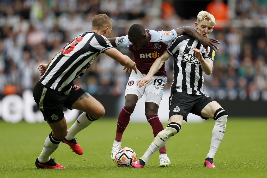 Aston Villa’s Moussa Diaby, center, attempts to keep the ball from Newcastle’s Dan Burn, left, and Newcastle’s Anthony Gordon during the English Premier League soccer match between Newcastle and Aston Villa at St. James’ Park in Newcastle, England, Saturday, Aug. 12, 2023. (AP Photo/Steve Luciano)