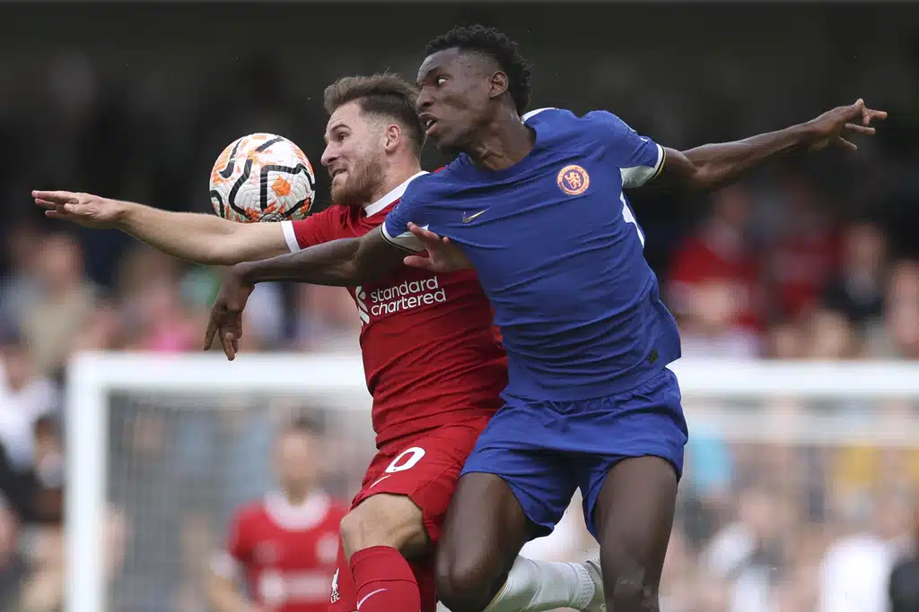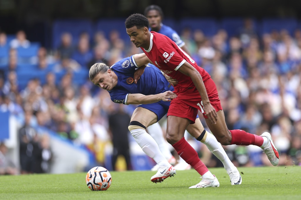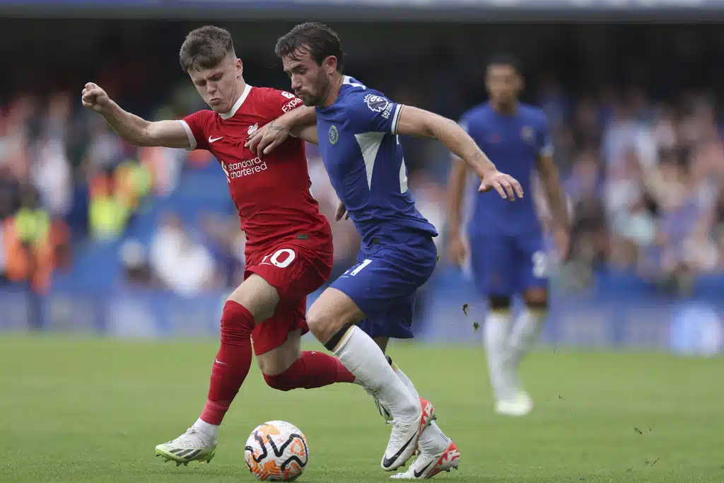 Liverpool’s Ben Doak, left, challenges for the ball with Chelsea’s Ben Chilwell during the English Premier League soccer match between Chelsea and Liverpool at Stamford Bridge Stadium in London, Sunday, Aug. 13, 2023. (AP Photo/Ian Walton)