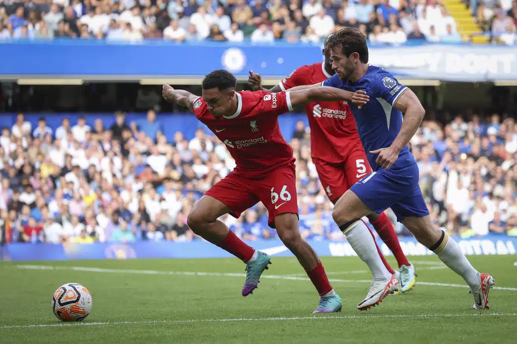 Liverpool’s Trent Alexander-Arnold, left, challenges for the ball with Chelsea’s Ben Chilwell during the English Premier League soccer match between Chelsea and Liverpool at Stamford Bridge Stadium in London, Sunday, Aug. 13, 2023. (AP Photo/Ian Walton)