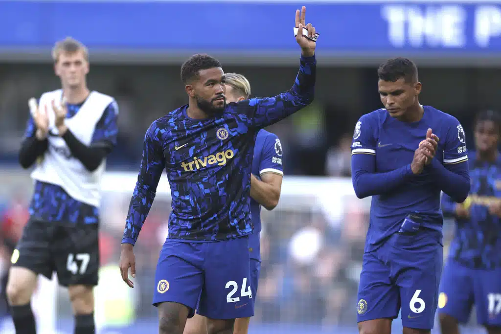 Chelsea’s Reece James, centre, and Chelsea’s Thiago Silva applaud fans at the end of the English Premier League soccer match between Chelsea and Liverpool at Stamford Bridge Stadium in London, Sunday, Aug. 13, 2023. (AP Photo/Ian Walton)