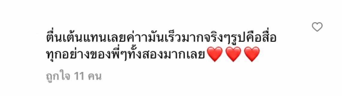 บอกเลยงานนี้ไอจีหวานฉ่ำ เพราะสาวคิมเบอร์ลี่เองก็ไม่น้อยหน้า เข้ามาคอมเมนต์ใต้โพสต์ดังกล่าวว่า “My love my life” แปลความหมายแบบซึ้ง ๆ ได้ว่า ที่รักของฉัน ชีวิตของฉัน นอกจากนี้ แฟน ๆ ก็ได้เข้ามาคอมเมนต์แสดงความยินดีกับการแต่งงานที่ใกล้จะถึงนี้ อีกทั้งบางส่วนยังบอกด้วยว่า ชอบคำว่า คู่ชีวิต ชีวิตคู่ เพราะชีวิตครึ่งหนึ่งของแต่ละคนมารวมกันแล้ว