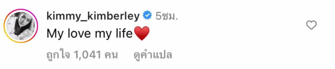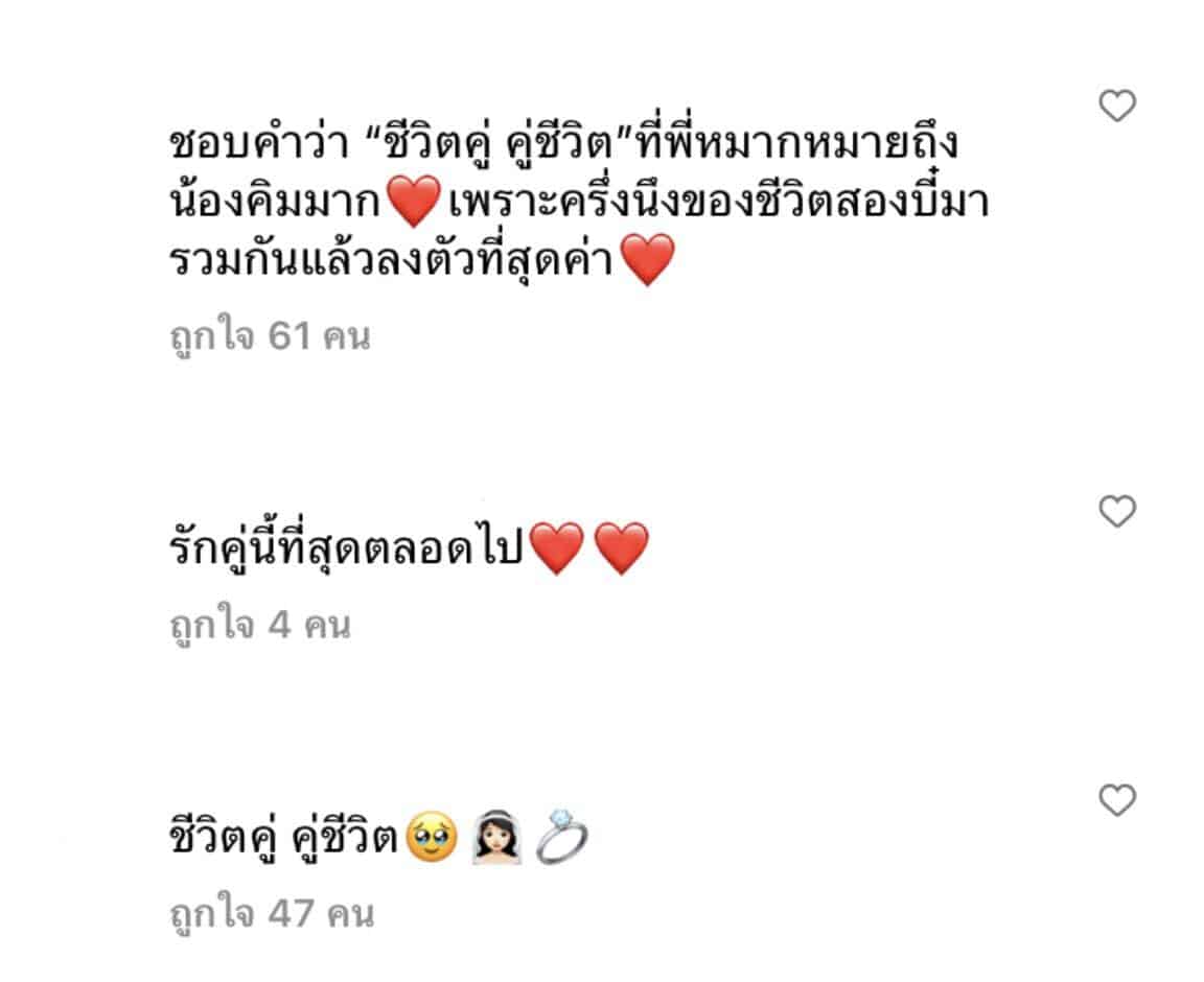 บอกเลยงานนี้ไอจีหวานฉ่ำ เพราะสาวคิมเบอร์ลี่เองก็ไม่น้อยหน้า เข้ามาคอมเมนต์ใต้โพสต์ดังกล่าวว่า “My love my life” แปลความหมายแบบซึ้ง ๆ ได้ว่า ที่รักของฉัน ชีวิตของฉัน นอกจากนี้ แฟน ๆ ก็ได้เข้ามาคอมเมนต์แสดงความยินดีกับการแต่งงานที่ใกล้จะถึงนี้ อีกทั้งบางส่วนยังบอกด้วยว่า ชอบคำว่า คู่ชีวิต ชีวิตคู่ เพราะชีวิตครึ่งหนึ่งของแต่ละคนมารวมกันแล้ว