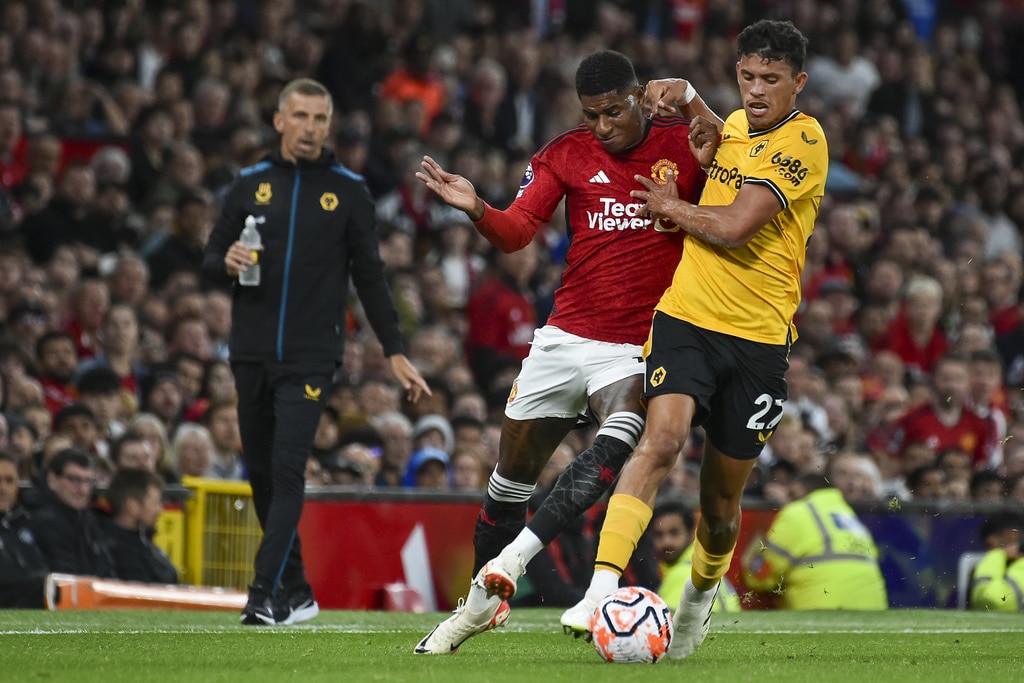Wolverhampton Wanderers’ Hwang Hee-chan, left, kicks the ball during the English Premier League soccer match between Manchester United and Wolverhampton at the Old Trafford stadium in Manchester, England, Monday, Aug. 14, 2023. (AP Photo/Rui Vieira)