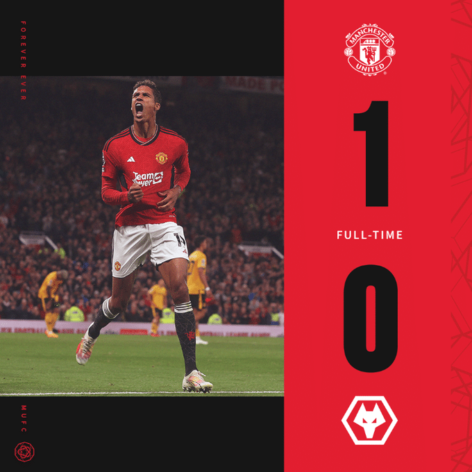 Manchester United’s Raphael Varane celebrates after scoring his side’s opening goal during the English Premier League soccer match between Manchester United and Wolverhampton at the Old Trafford stadium in Manchester, England, Monday, Aug. 14, 2023. (AP Photo/Rui Vieira)