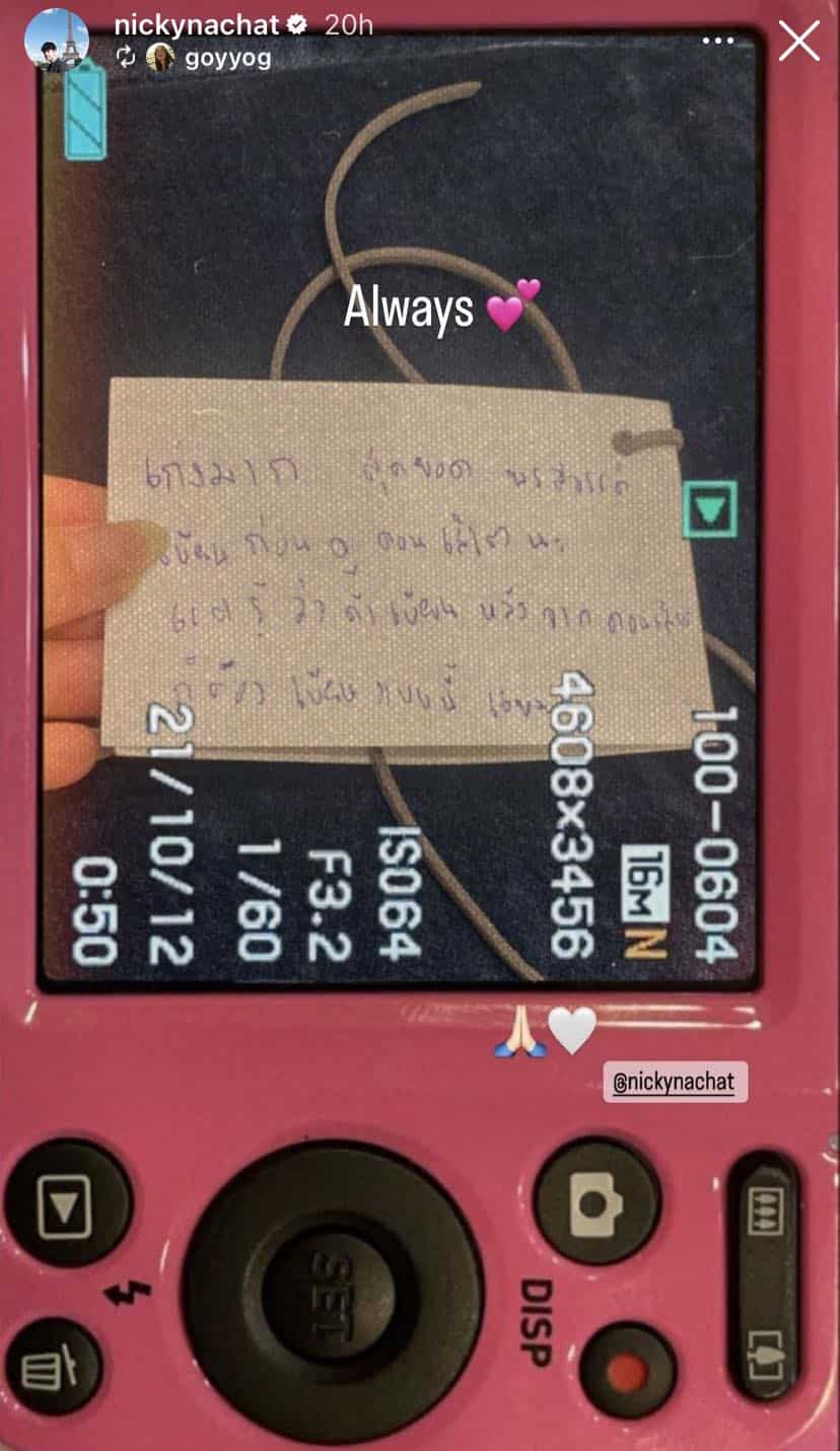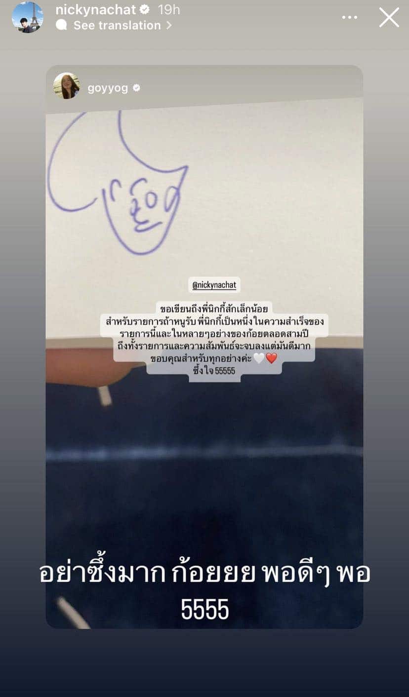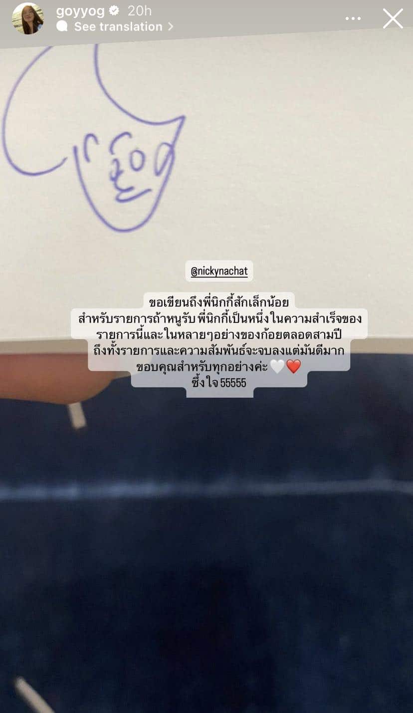 ความน่ารักยังไม่จบแค่นี้ เพราะหลังจากนั้น ก้อยก็ได้โพสต์สตอรี่ไอจีเพิ่มเติม เผยความในใจที่มีต่อนิกกี้ ไว้ว่า “ขอเขียนถึงพี่นิกกี้สักเล็กน้อยสำหรับรายการถ้าหนูรับ พี่นิกกี้เป็นหนึ่งในความสำเร็จของรายการนี้และในหลายๆ อย่างของก้อยตลอดสามปี ถึงทั้งรายการและความสัมพันธ์จะจบลงแต่มันดีมาก ขอบคุณสำหรับทุกอย่างค่ะ ซึ้งใจ 55555”
