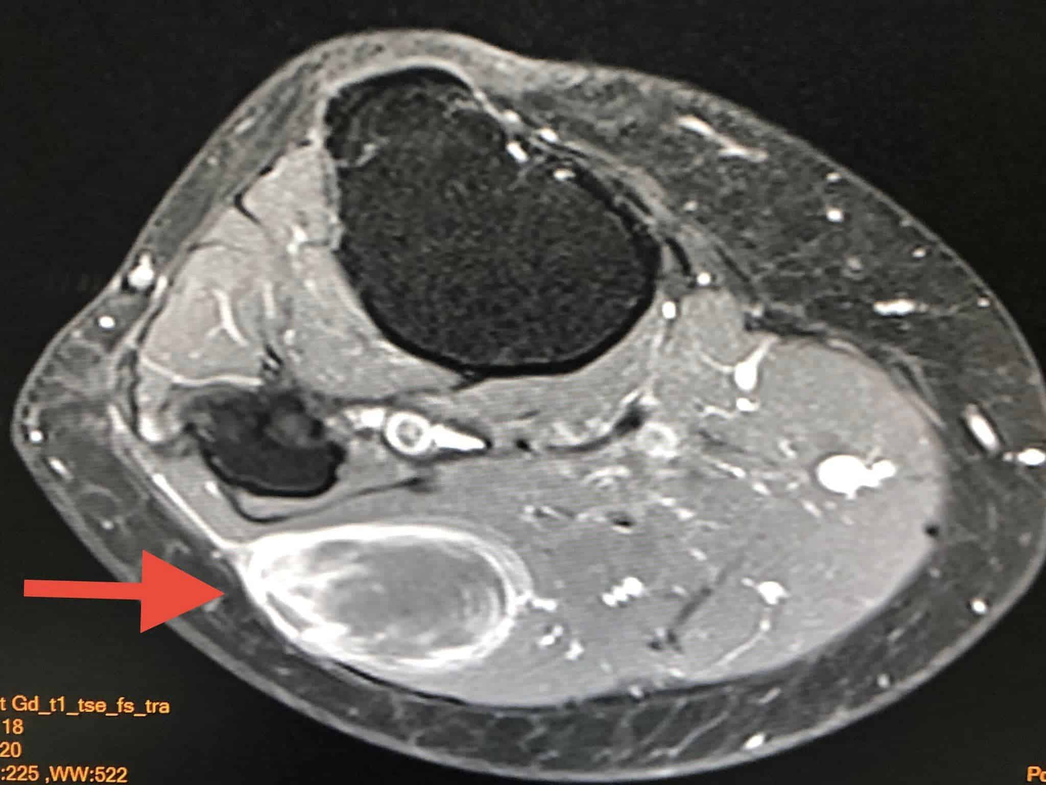 ผู้ป่วยหญิงอายุ 61 ปี ปกติแข็งแรงดี คลำได้ก้อนที่ขาใต้หัวเข่าข้างขวาด้านนอกขนาด 5 เซนติเมตร (ดูรูป) ก้อนนูนแข็ง ขยับก้อนได้ ค่อยๆโตขึ้น ไม่เจ็บ เดือนมีนาคม 2565 ทำ MRI ตรวจคลื่นแม่เหล็กไฟฟ้า พบก้อนขนาด 3.5 x 2.2 x 5.1 เซนติเมตร อยู่ชั้นใต้ผิวหนังติดกับกล้ามเนื้อของขา สงสัยมะเร็งเนื้อเยื่ออ่อน (soft tissue sarcoma) (ดูรูป)
