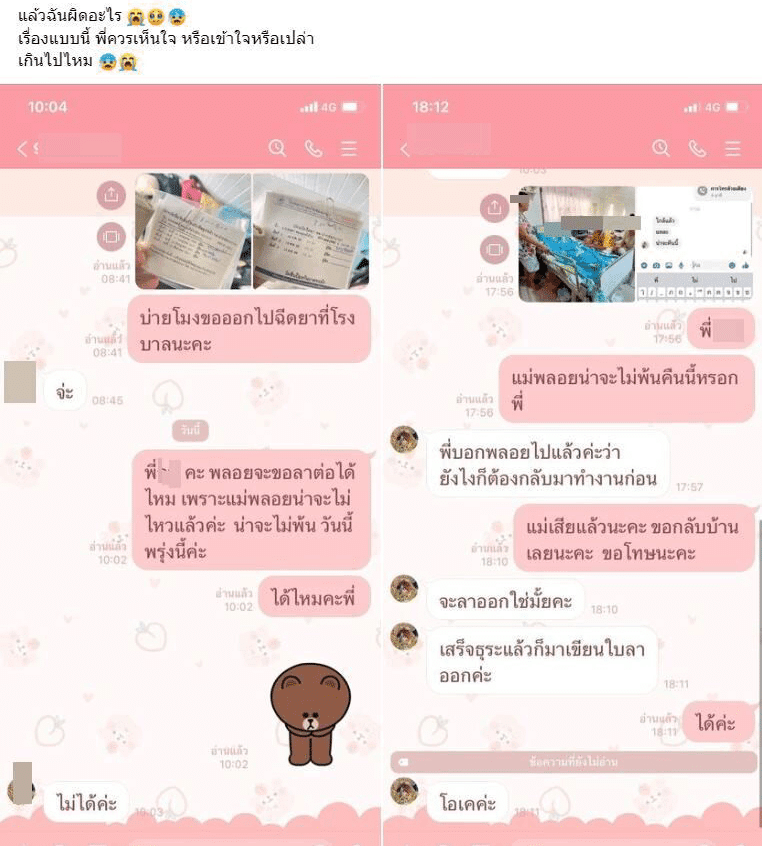 ทางหัวหน้าตอบมาว่า ไม่ได้ค่ะ จากนั้นทางสาวเจ้าของโพสต์ส่งภาพแม่ที่นอนป่วยไปในแชท พร้อมบอกว่า แม่พลอยน่าจะไม่พ้นคืนนี้หรอกพี่ แต่ทางหัวหน้าตอบกลับมาว่า พี่บอกพลอยไปแล้วค่ะว่า ยังไงก็ต้องกลับมาทำงานก่อน