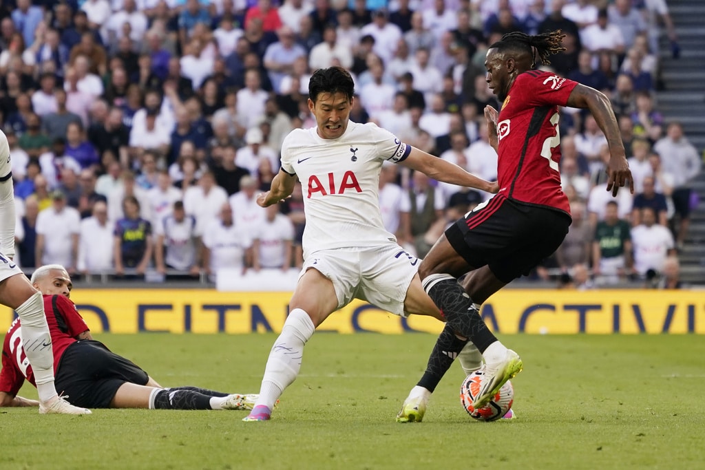 Tottenham’s Son Heung-min, centre, and Manchester United’s Aaron Wan-Bissaka, right, challenge for the ball during the Premier League soccer match between Tottenham Hotspur and Manchester United at the Tottenham Hotspur Stadium in London, England, Saturday, Aug. 19, 2023. (AP Photo/Alberto Pezzali)