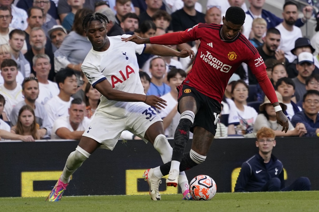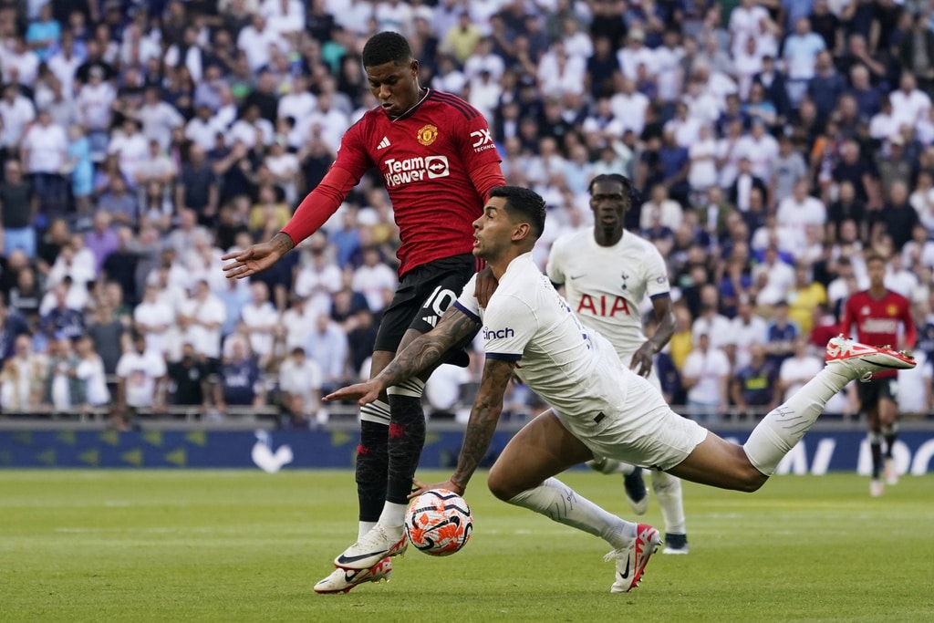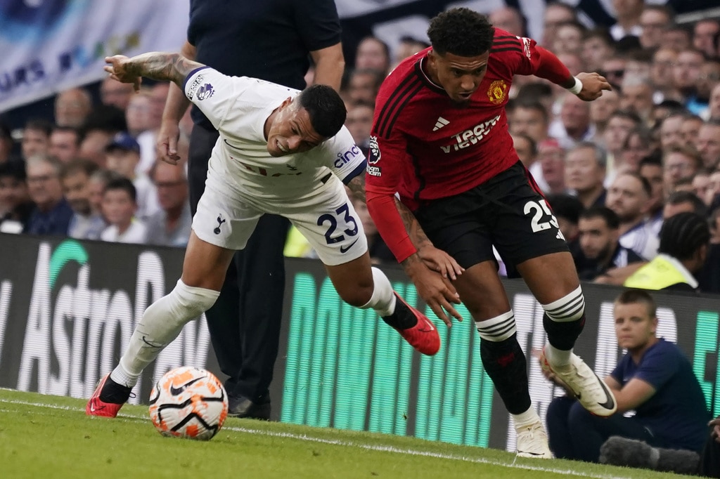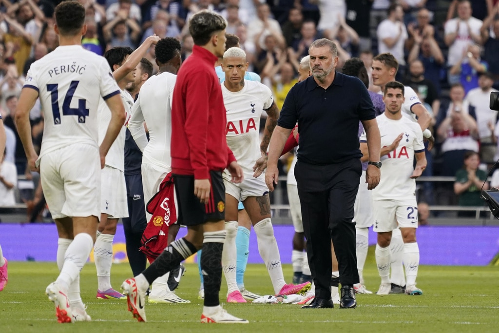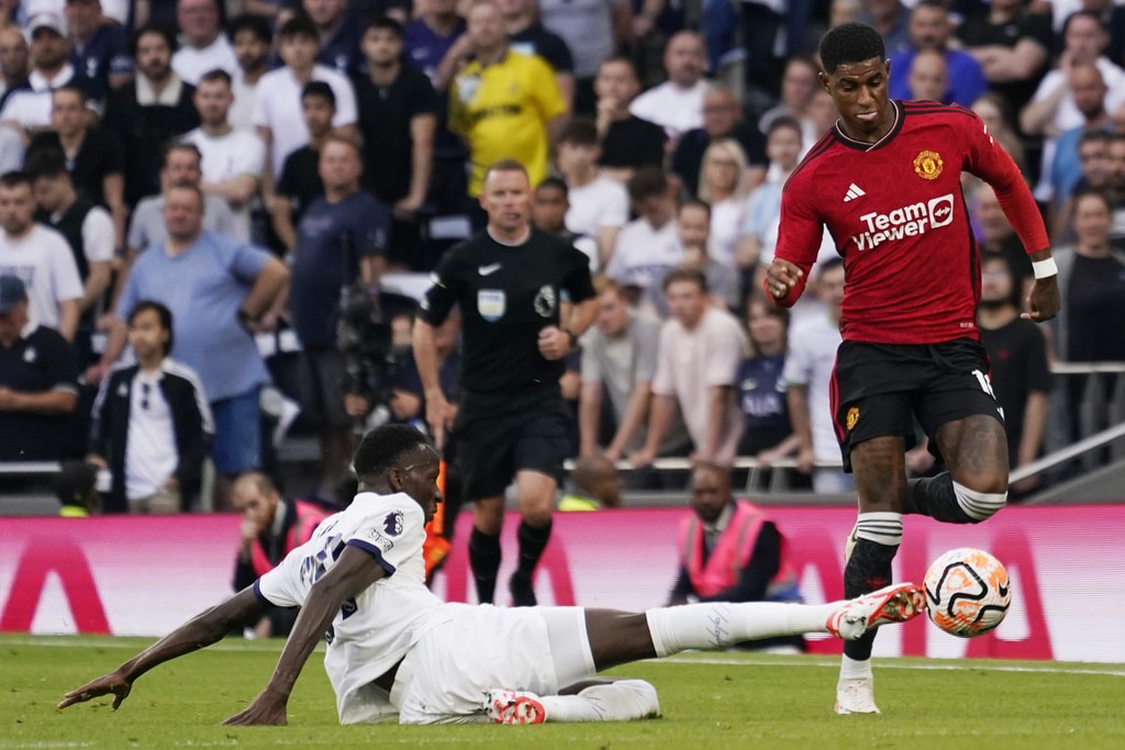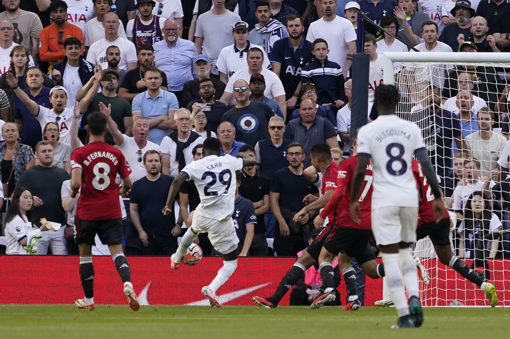 Tottenham’s Pape Matar Sarr, centre, scores the opening goal during the Premier League soccer match between Tottenham Hotspur and Manchester United at the Tottenham Hotspur Stadium in London, England, Saturday, Aug. 19, 2023. (AP Photo/Alberto Pezzali)Manchester United’s Marcus Rashford, centre, and Tottenham’s Cristian Romero challenge for the ball during the Premier League soccer match between Tottenham Hotspur and Manchester United at the Tottenham Hotspur Stadium in London, England, Saturday, Aug. 19, 2023. (AP Photo/Alberto Pezzali)Manchester United’s Marcus Rashford, right, and Tottenham’s Pape Matar Sarr challenge for the ball during the Premier League soccer match between Tottenham Hotspur and Manchester United at the Tottenham Hotspur Stadium in London, England, Saturday, Aug. 19, 2023. (AP Photo/Alberto Pezzali)Manchester United’s Jadon Sancho, right, and Tottenham’s Pedro Porro challenge for the ball during the Premier League soccer match between Tottenham Hotspur and Manchester United at the Tottenham Hotspur Stadium in London, England, Saturday, Aug. 19, 2023. (AP Photo/Alberto Pezzali)Manchester United’s Jadon Sancho, right, and Tottenham’s Pedro Porro challenge for the ball during the Premier League soccer match between Tottenham Hotspur and Manchester United at the Tottenham Hotspur Stadium in London, England, Saturday, Aug. 19, 2023. (AP Photo/Alberto Pezzali)Tottenham’s team players celebrate after Pape Matar Sarr scored the opening goal during the Premier League soccer match between Tottenham Hotspur and Manchester United at the Tottenham Hotspur Stadium in London, England, Saturday, Aug. 19, 2023. (AP Photo/Alberto Pezzali)Tottenham’s Micky van de Ven, centre, challenges for the ball with Manchester United’s Raphael Varane, centre right, and Lisandro Martinez, centre left, during the Premier League soccer match between Tottenham Hotspur and Manchester United at the Tottenham Hotspur Stadium in London, England, Saturday, Aug. 19, 2023. (AP Photo/Alberto Pezzali)Tottenham’s James Maddison celebrates after the Premier League soccer match between Tottenham Hotspur and Manchester United at the Tottenham Hotspur Stadium in London, England, Saturday, Aug. 19, 2023. (AP Photo/Alberto Pezzali)Tottenham’s head coach Ange Postecoglou, second from right, celebrates with his team as they won the Premier League soccer match between Tottenham Hotspur and Manchester United at the Tottenham Hotspur Stadium in London, England, Saturday, Aug. 19, 2023. (AP Photo/Alberto Pezzali)Manchester United’s Marcus Rashford, right, and Tottenham’s Destiny Udogie challenge for the ball during the Premier League soccer match between Tottenham Hotspur and Manchester United at the Tottenham Hotspur Stadium in London, England, Saturday, Aug. 19, 2023. (AP Photo/Alberto Pezzali)