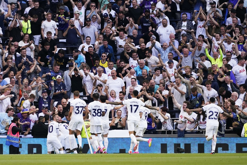 Tottenham’s team players celebrate after Pape Matar Sarr scored the opening goal during the Premier League soccer match between Tottenham Hotspur and Manchester United at the Tottenham Hotspur Stadium in London, England, Saturday, Aug. 19, 2023. (AP Photo/Alberto Pezzali)