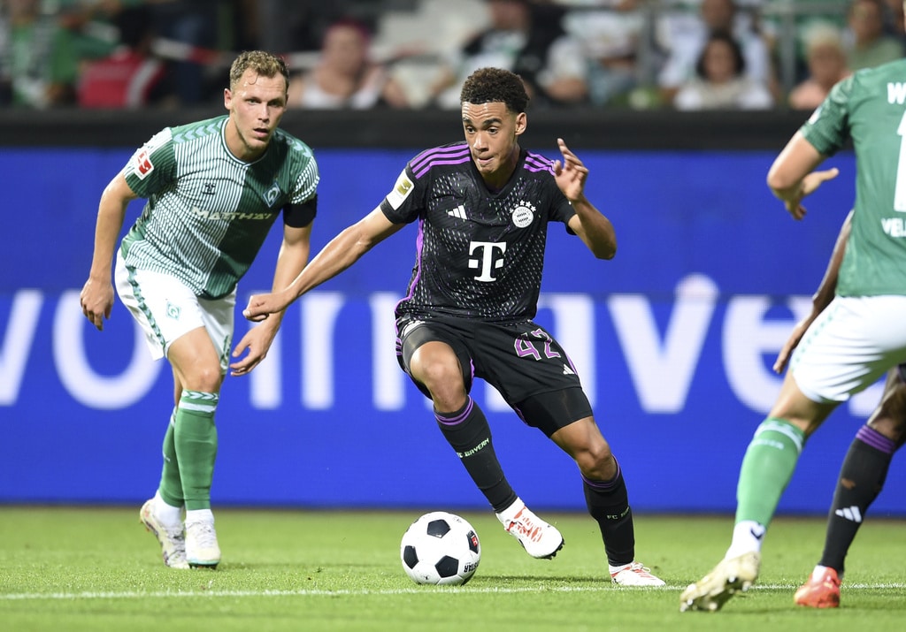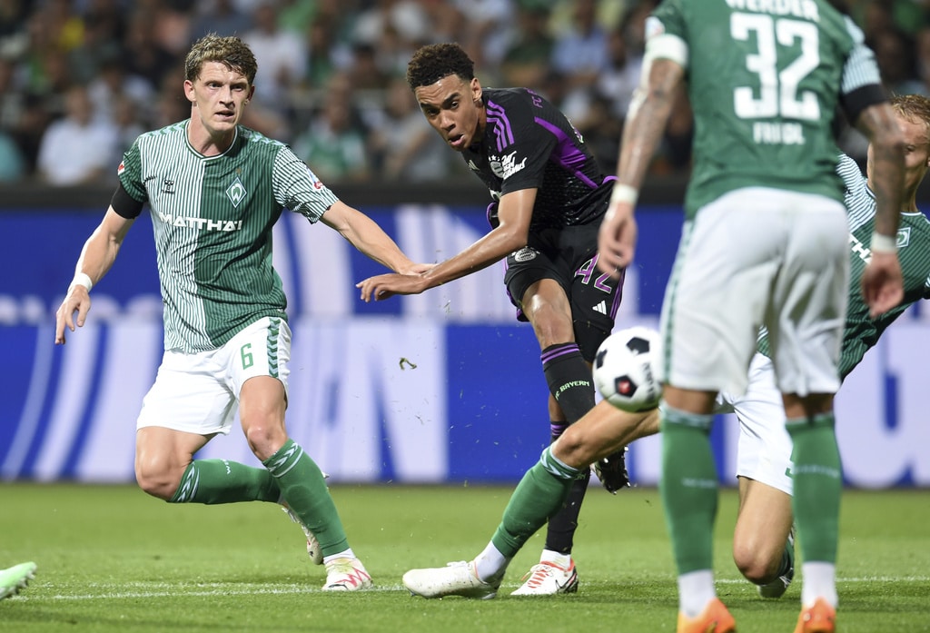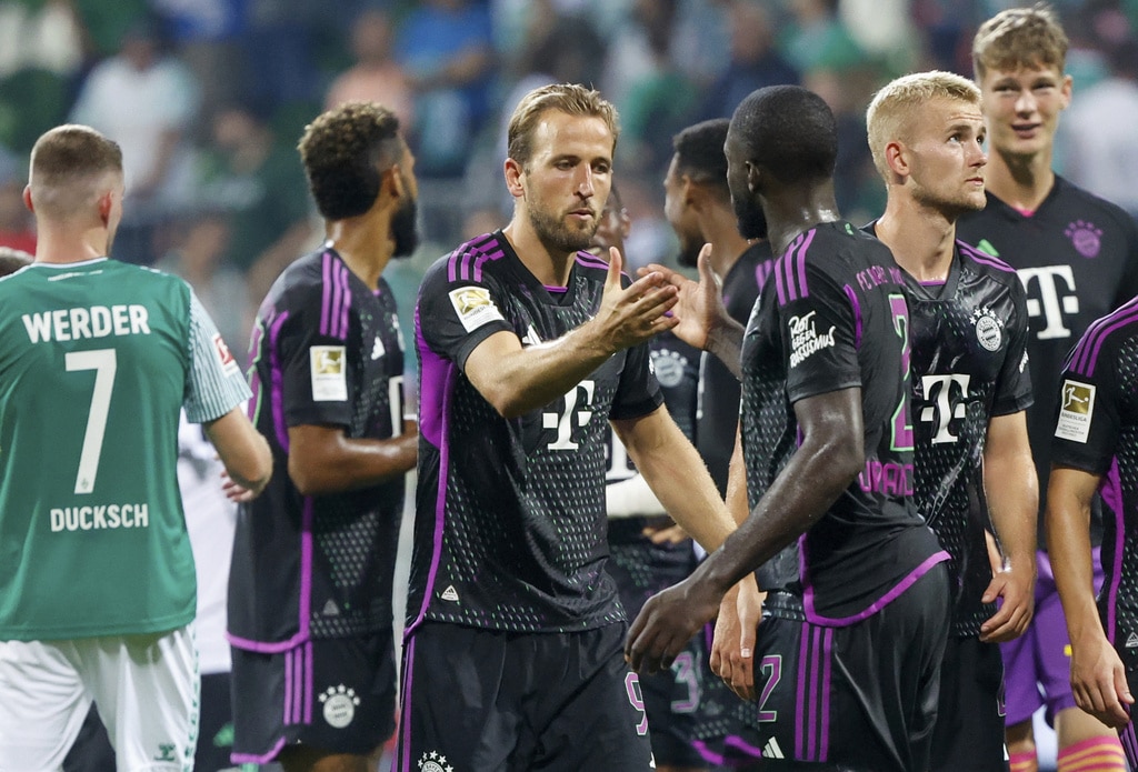 Bremen’s Marco Friedl, right, and Bayern’s Harry Kane fight for the ball during the German Bundesliga soccer match between Werder Bremen and Bayern Munich, at the Weserstadion in Bremen, Germany, Friday, Aug. 18, 2023. (Axel Heimken/dpa via AP)Bayern’s Harry Kane in action during the German Bundesliga soccer match between Werder Bremen and Bayern Munich, at the Weserstadion in Bremen, Germany, Friday, Aug. 18, 2023. (Axel Heimken/dpa via AP)Bayern’s Harry Kane celebrates scoring, during the German Bundesliga soccer match between Werder Bremen and Bayern Munich, at the Weserstadion in Bremen, Germany, Friday, Aug. 18, 2023. (Axel Heimkendpa via AP)Bayern’s Harry Kane celebrates scoring with teammate Leroy Sane, during the German Bundesliga soccer match between Werder Bremen and Bayern Munich, at the Weserstadion in Bremen, Germany, Friday, Aug. 18, 2023. (Axel Heimkendpa via AP)Bayern’s Harry Kane goes into the dressing room at half-time, during the German Bundesliga soccer match between Werder Bremen and Bayern Munich, at the Weserstadion in Bremen, Germany, Friday, Aug. 18, 2023. (Carmen Jaspersen/dpa via AP)Bayern’s Leon Goretzka, foreground vies for the ball, during the German Bundesliga soccer match between Werder Bremen and Bayern Munich, at the Weserstadion in Bremen, Germany, Friday, Aug. 18, 2023. (Axel Heimken/dpa via AP)Bremen’s Jens Stage, left and Bayern’s Jamal Musiala fight for the ball, during the German Bundesliga soccer match between Werder Bremen and Bayern Munich, at the Weserstadion in Bremen, Germany, Friday, Aug. 18, 2023. (Carmen Jaspersen/dpa via AP)Bremen’s Senne Lynen, left and Bayern’s Jamal Musiala vie for the ball, during the German Bundesliga soccer match between Werder Bremen and Bayern Munich, at the Weserstadion in Bremen, Germany, Friday, Aug. 18, 2023. (Carmen Jaspersen/dpa via AP)