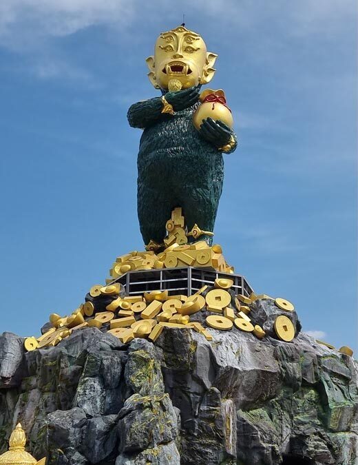 กลายเป็นเรื่องที่เทพจำแลง พระพุทธศาสนายังไม่หมดอายุ ยังอยู่ได้อีกเป็น 1,000 ปี ทำไมรีบแซงคิวเหลือเกิน ตั้งแต่โรงแรมเอราวัณเอาพระพรหมไป องค์แรกก็โดนทุบไปแล้ว พระพรหมมี 4 แขน ยังปกป้องตัวเองไม่ได้ เพราะฉะนั้นการไปพึ่ง 4 หู 5 ตาที่แปลกๆ เป็นการตลาดที่ทำอย่างไรจะดึงคนเข้าไป เกิดการขายของตามมา ที่บอกว่ากินถ่านดำก็คล้ายๆ กับราหูต้องกินไก่ดำ อะไรดำๆ ศาสนาพุทธเป็นศาสนาสีขาวไม่ชอบสีดำ สีดำมักจะไปงานศพ ไปปฏิบัติธรรมหรือทำอะไรก็จะใช้สีขาว เพราะฉะนั้นชาวพุทธหยุดเป็นชาวพุทธหลายใจ ทิ้งสิ่งดั้งเดิมคือพระรัตนตรัย สิ่งเหล่านี้ไม่ค่อยเกิดขึ้นฝั่งภาคใต้ มักจะไปเกิดสิ่งวิปริตที่ฝั่งภาคเหนือ ภาคกลาง และภาคอีสาน ไม่ค่อยพึ่งตัวเอง ไปพึ่งอะไรไม่รู้