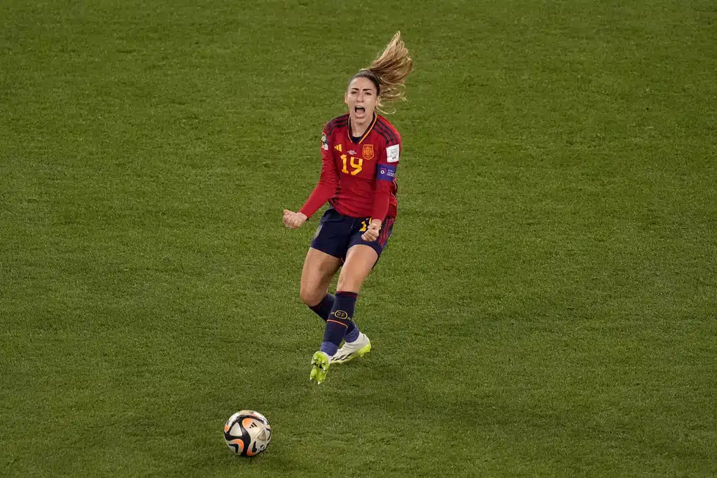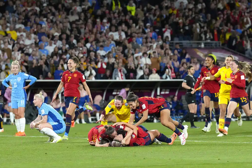 SYDNEY, AUSTRALIA – AUGUST 20: Aitana Bonmati of Spain celebrate after the team’s victory in the FIFA Women’s World Cup Australia & New Zealand 2023 Final match between Spain and England at Stadium Australia on August 20, 2023 in Sydney / Gadigal, Australia. (Photo by Elsa – FIFA/FIFA via Getty Images)Spain’s Olga Carmona celebrates after scoring a goal during the Women’s World Cup soccer final between Spain and England at Stadium Australia in Sydney, Australia, Sunday, Aug. 20, 2023. (AP Photo/Mark Baker)SYDNEY, AUSTRALIA – AUGUST 20: (L-R) Teresa Abelleira, Ona Batlle, Oihane Hernandez and Alexia Putellas of Spain celebrate after the team’s victory in the FIFA Women’s World Cup Australia & New Zealand 2023 Final match between Spain and England at Stadium Australia on August 20, 2023 in Sydney, Australia. (Photo by Cameron Spencer/Getty Images)Spain’s Esther Gonzalez, left, and Spain’s Alba Redondo celebrate with the trophy during the awarding ceremony of the Women’s World Cup soccer final at Stadium Australia in Sydney, Australia, Sunday, Aug. 20, 2023. (AP Photo/Alessandra Tarantino)Team Spain celebrates with the trophy after winning the Women’s World Cup soccer final against England at Stadium Australia in Sydney, Australia, Sunday, Aug. 20, 2023. (AP Photo/Alessandra Tarantino)