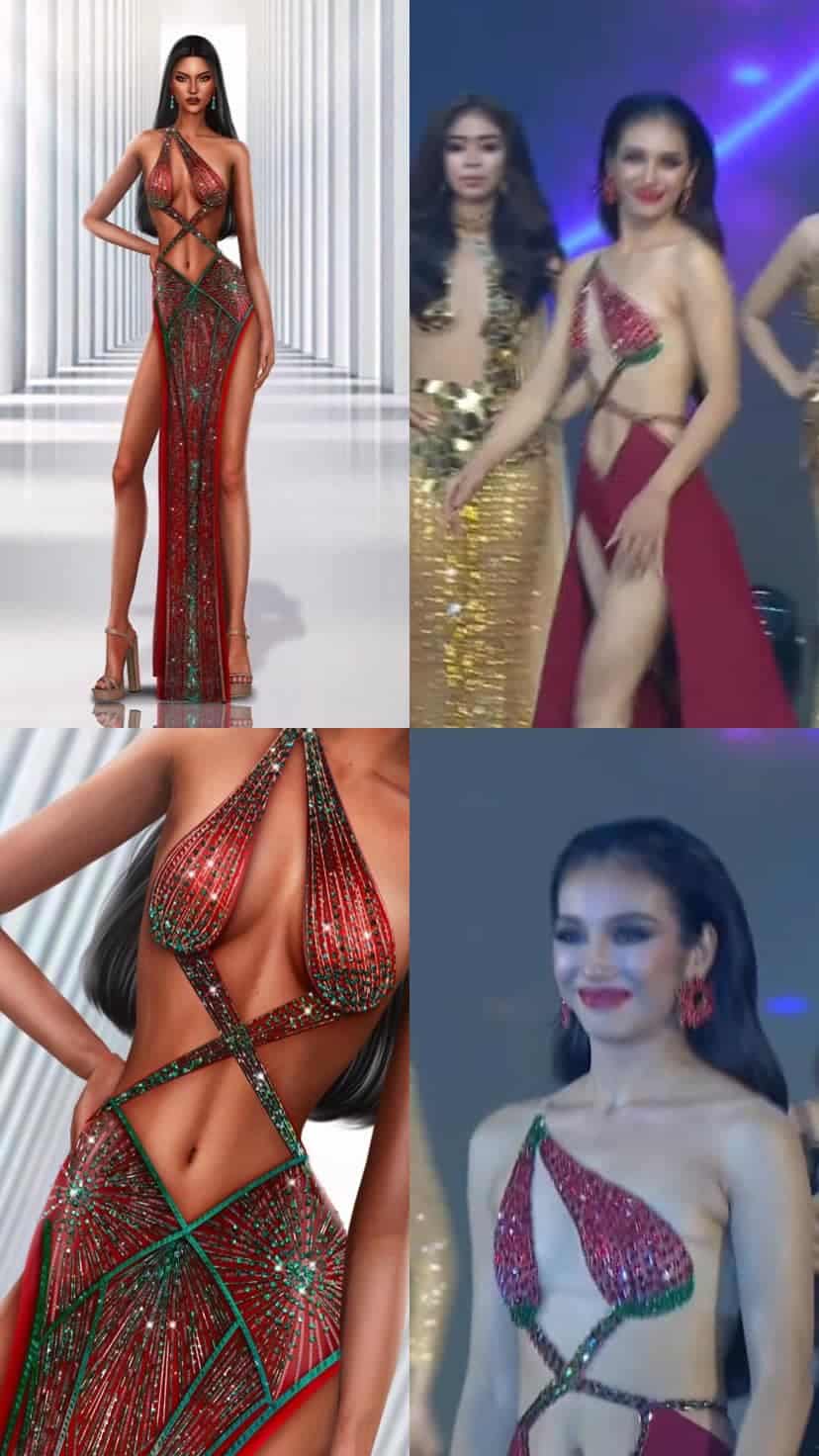 โดยดีไซน์เนอร์สาวคนนี้ระบุว่า “ผลงานที่ออกแบบไว้เมื่อปีที่แล้ว แต่วันนี้ถูกนำไปตัดใส่บนเวที Miss Grand Cambodia โดยที่ไม่ได้รับอนุญาตจากเรา จากที่เห็นนี่ไม่ใช่ความบังเอิญ หรือแรงบันดาลใจ นี่คือก็อปปี้ทั้งลายปัก การเล่นสี แพทเทิร์นของชุด ต่างกันแค่ไม่ได้ปักกระโปรง