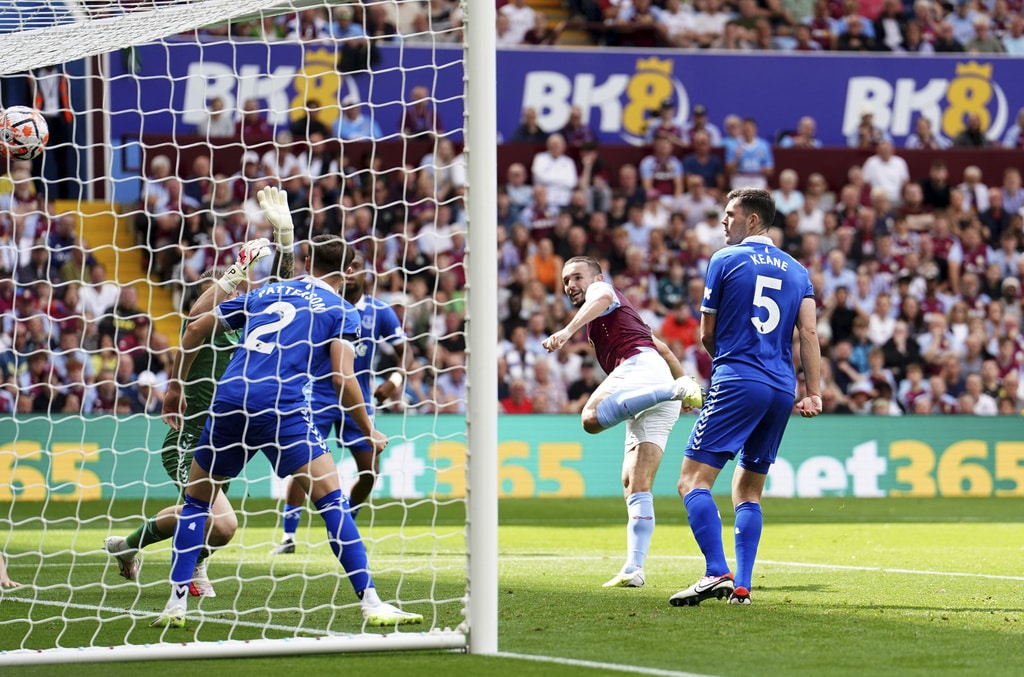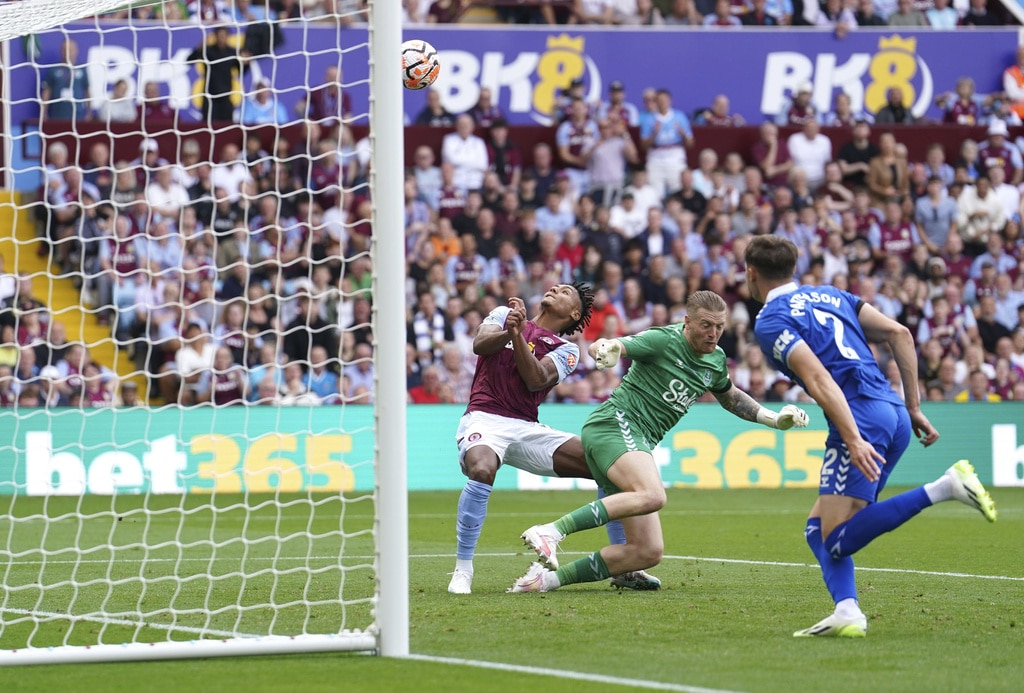 Everton goalkeeper Jordan Pickford takes down Aston Villa’s Ollie Watkins resulting in a penalty, during the English Premier League soccer match between Aston Villa and Everton at Villa Park, in Birmingham, England, Sunday, Aug. 20, 2023. (David Davies/PA via AP)Aston Villa’s Ollie Watkins appears injured, during the English Premier League soccer match between Aston Villa and Everton at Villa Park, in Birmingham, England, Sunday, Aug. 20, 2023. (David Davies/PA via AP)Aston Villa’s Jhon Duran celebrates scoring their side’s fourth goal of the game, during the English Premier League soccer match between Aston Villa and Everton at Villa Park, in Birmingham, England, Sunday, Aug. 20, 2023. (Nick Potts/PA via AP)Aston Villa’s John McGinn scores the opening goal, during the English Premier League soccer match between Aston Villa and Everton at Villa Park, in Birmingham, England, Sunday, Aug. 20, 2023. (David Davies/PA via AP)