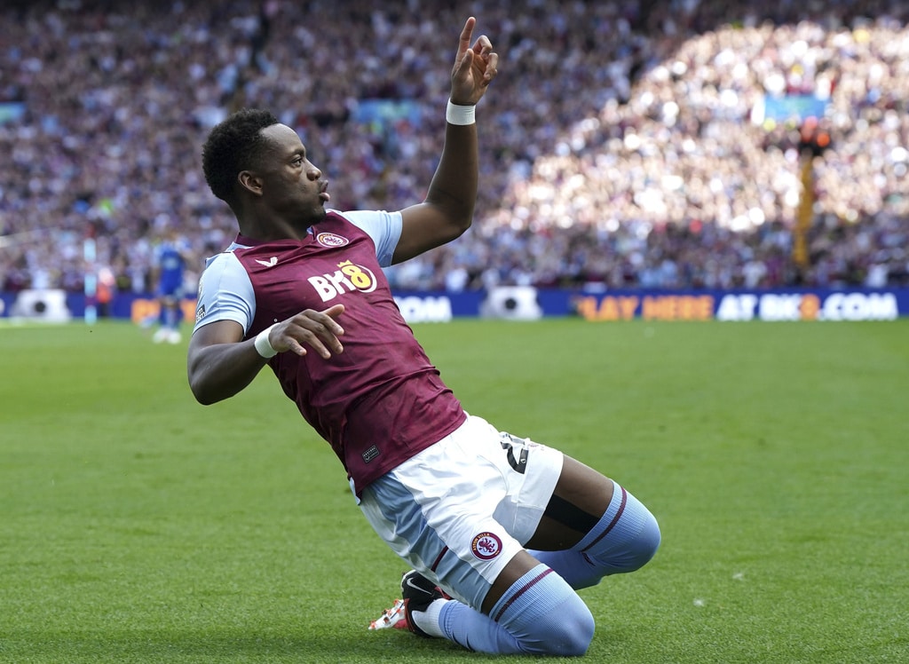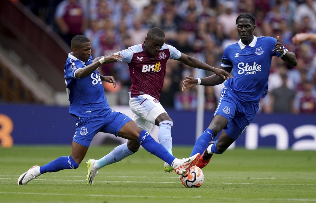 Aston Villa’s Moussa Diaby is tackled by Everton’s Ashley Young, left, during the English Premier League soccer match between Aston Villa and Everton at Villa Park, in Birmingham, England, Sunday, Aug. 20, 2023. (David Davies/PA via AP)