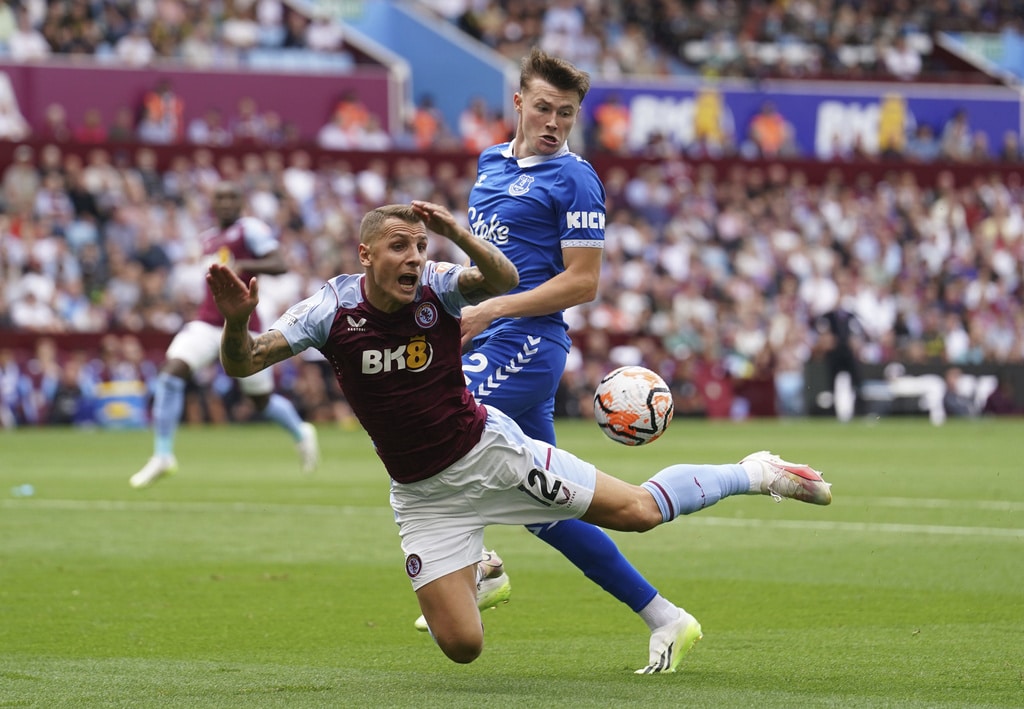Aston Villa’s Lucas Digne is tackled by Everton’s Nathan Patterson, during the English Premier League soccer match between Aston Villa and Everton at Villa Park, in Birmingham, England, Sunday, Aug. 20, 2023. (David Davies/PA via AP)