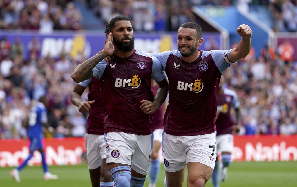 Aston Villa’s Douglas Luiz, left celebrates scoring his side’s second goal, during the English Premier League soccer match between Aston Villa and Everton at Villa Park, in Birmingham, England, Sunday, Aug. 20, 2023. (David Davies/PA via AP)