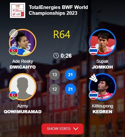 การแข่งขันแบดมินตันรายการ โททาลเอนเนอร์ยี่ส์ บีดับเบิลยูเอฟ เวิลด์ แชมเปี้ยนชิพ หรือ แบดมินตัน ชิงแชมป์โลก 2023 ที่รอยัล อารีน่า ในกรุงโคเปเฮเก้น ประเทศเดนมาร์ก เมื่อวันจันทร์ที่ 21 ส.ค.66 ที่ผ่านมา เป็นการแข่งขันรอบแรก