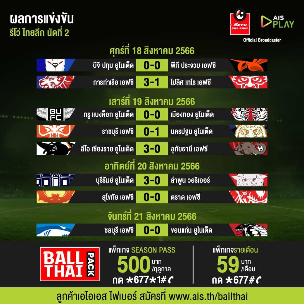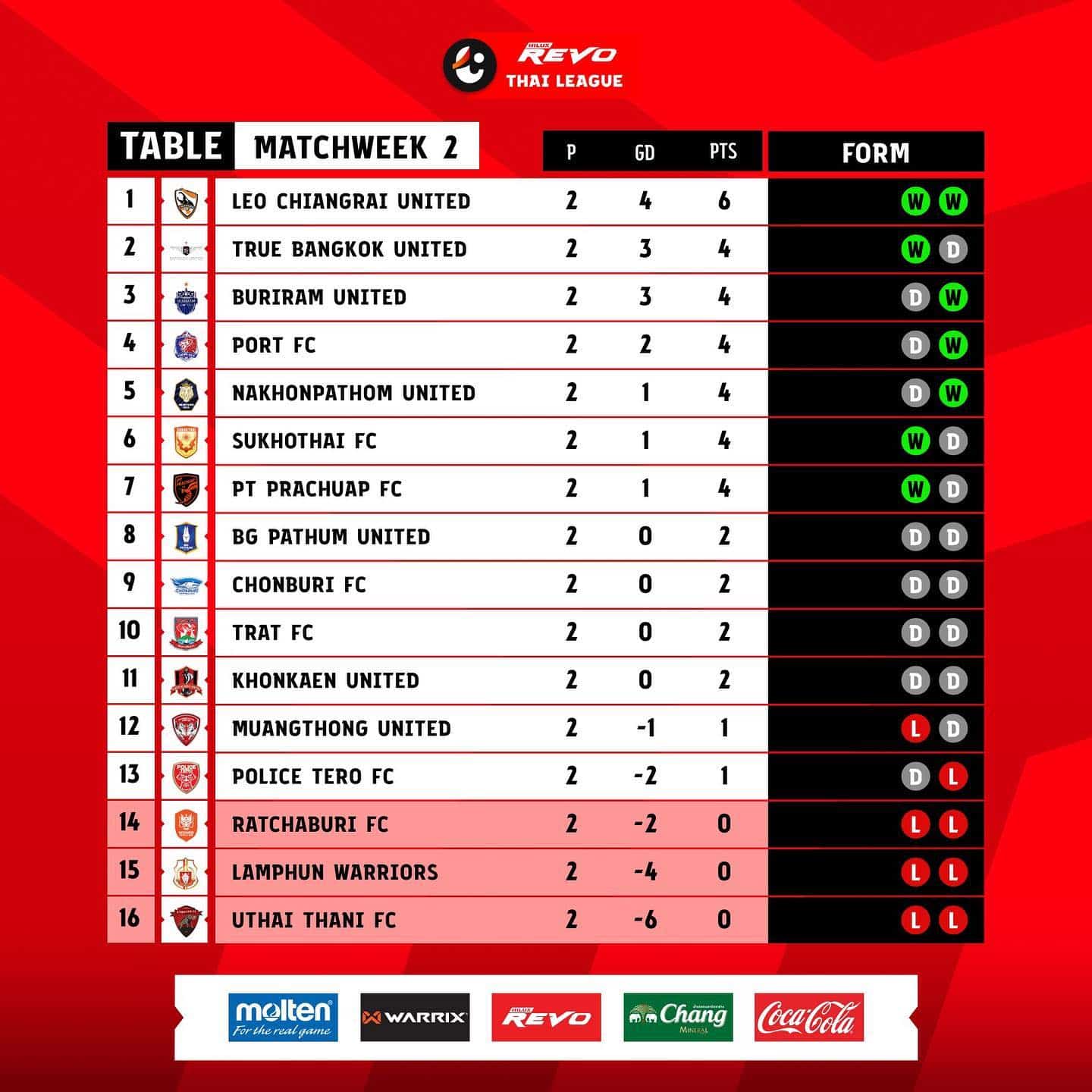 สรุปผลการแข่งขัน รีโว่ ไทยลีก 2023/24 หลังจบนัดที่ 2