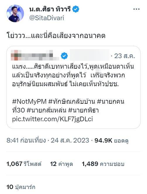 วันที่ 24 สิงหาคม 2566 บัญชีทวิตเตอร์ของ น.ต.ศิธา ทิวารี @SitaDivari แกนนำพรรคไทยสร้างไทย ได้รีทวีต (Retweet) เนื้อหาการแสดงความคิดเห็นของผู้ใช้บัญชีเอ็กซ์ (X) แอคเคาต์หนึ่ง ซึ่งมีการลงคลิปวิดีโอเมื่อตอนที่แกนนำพรรคไทยสร้างไทยได้เคยกล่าวตอนหาเสียง ก่อนการเลือกตั้ง 66 ที่ผ่านมา