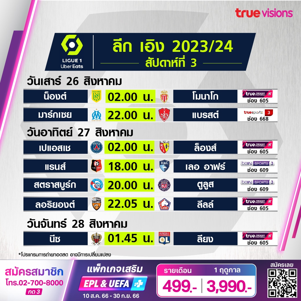 โปรแกรม ลีกเอิง ฝรั่งเศส 2023/24 สัปดาห์ที่3 แข่ง 25-27 ส.ค. นี้