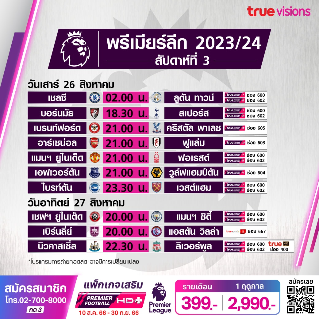 โปรแกรมพรีเมียร์ลีก 2023/24 สัปดาห์ที่ 3 แข่งวันที่ 25-27 ส.ค นี้ เช็คตารางแข่งพร้อมช่องดูบอลสด